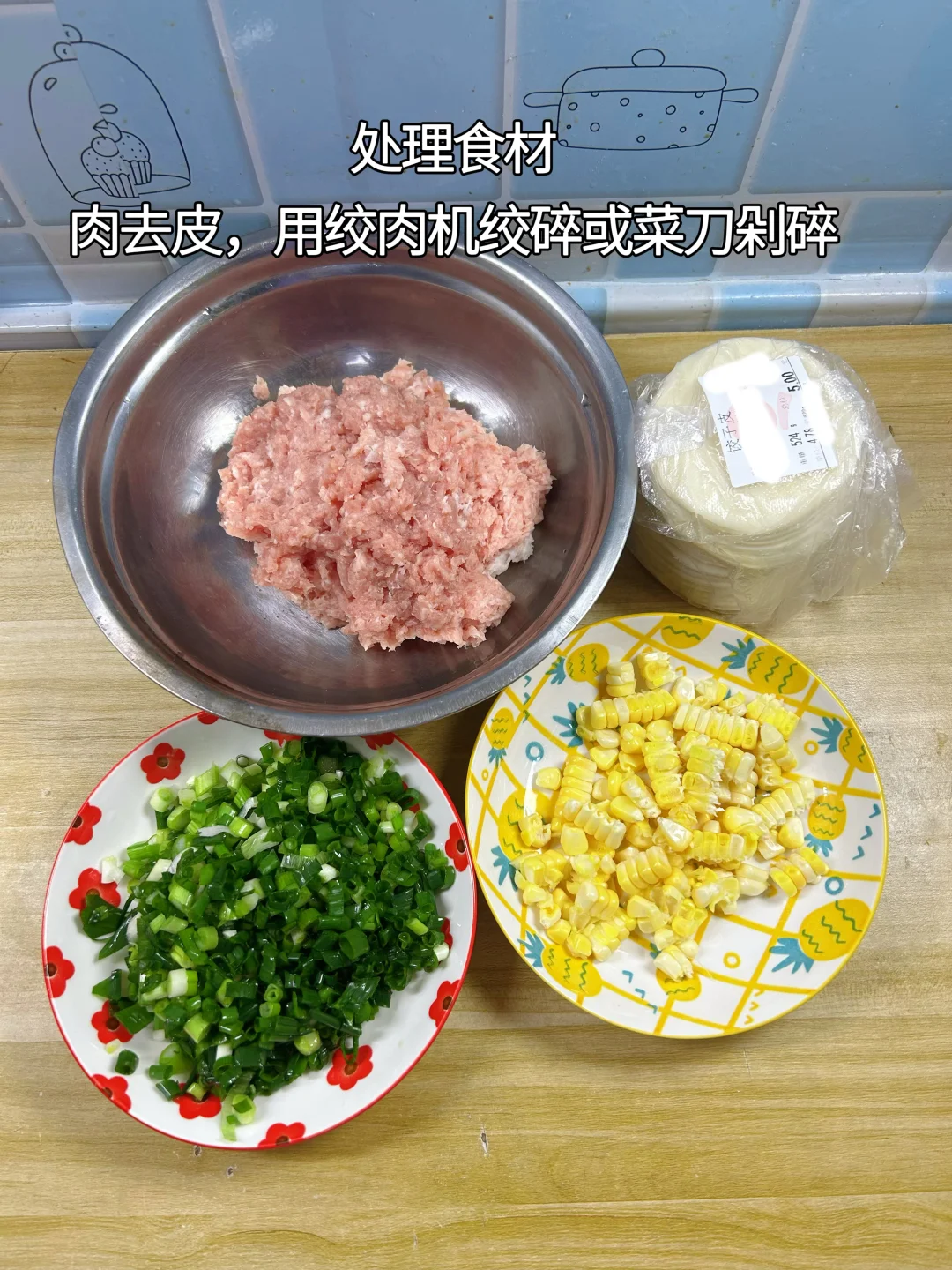 1.猪后腿肉、小葱、甜玉米、饺子皮