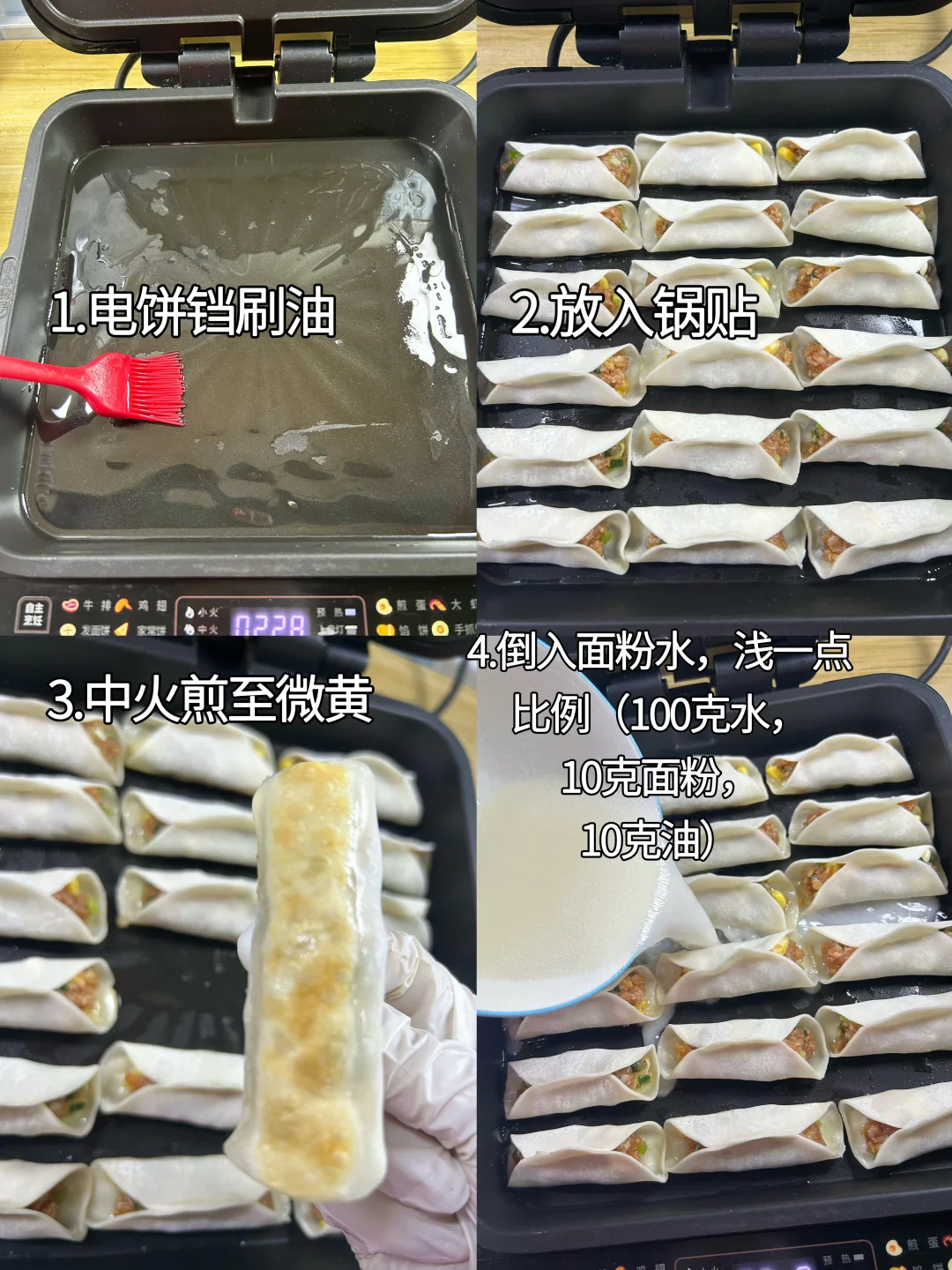 6.电饼铛预热刷油,只开下火,防止上面变老,放入锅贴,中火煎至底部微黄,倒入面糊水(100克水,10克面粉,10克油,搅拌均匀),这个很容易熟,面糊水要浅一点,过底部就行,不然很难收干。