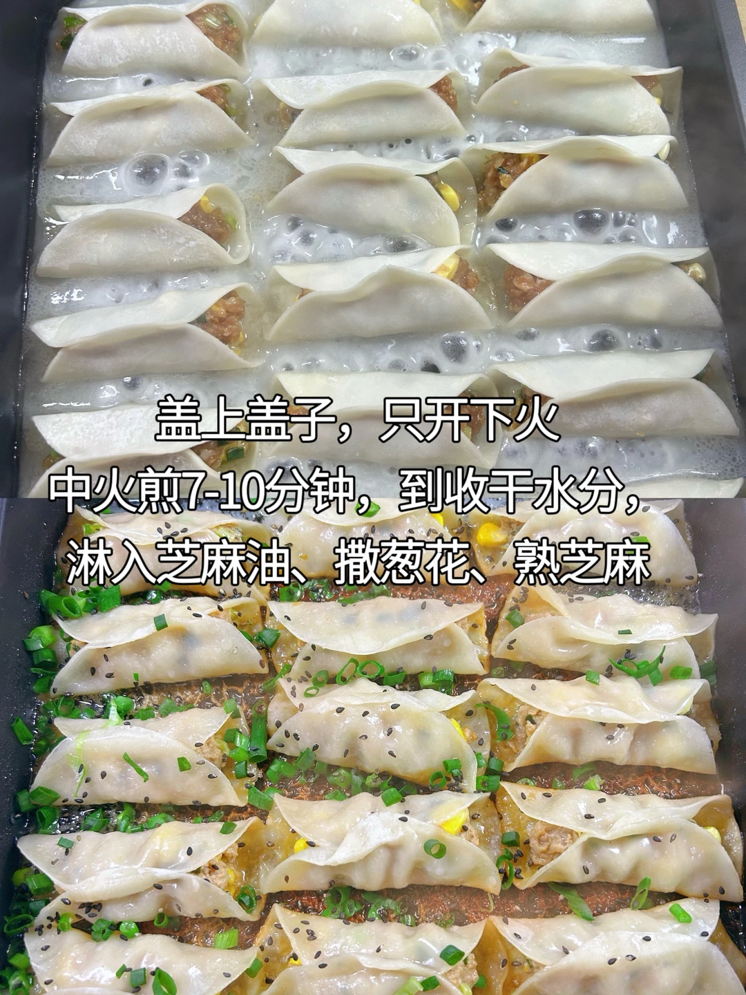 7.盖上盖子,注意上火不用开,中火煎7—10分钟,注意观察,收干水分。淋入芝麻油,撒葱花,熟芝麻,再盖一分钟,焖一下葱花更香。