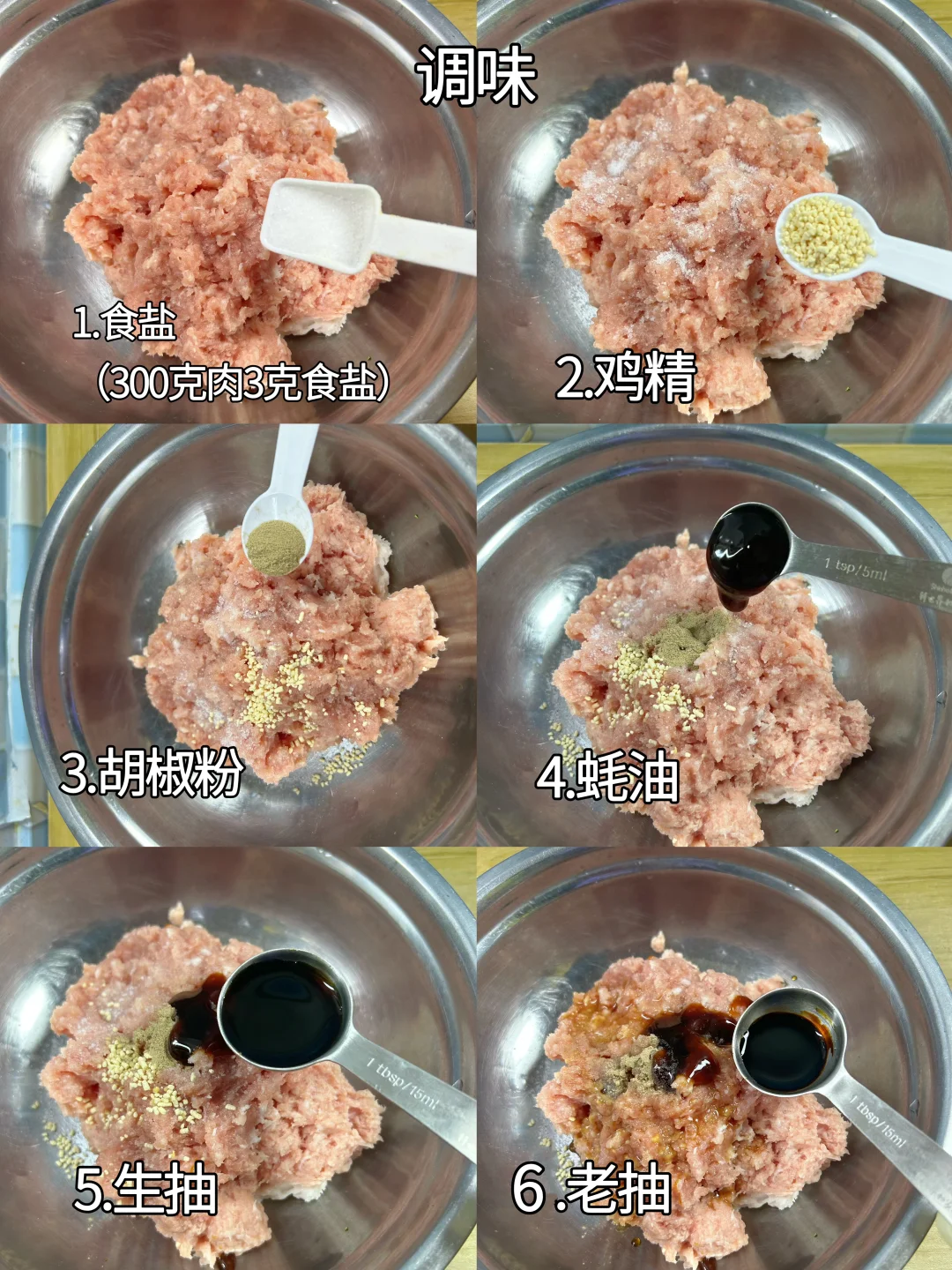 3.馅料调味,300—400克肉末加3克食盐、0.5克鸡精、0.5克胡椒粉、5克蚝油、15克生抽、5克老抽。