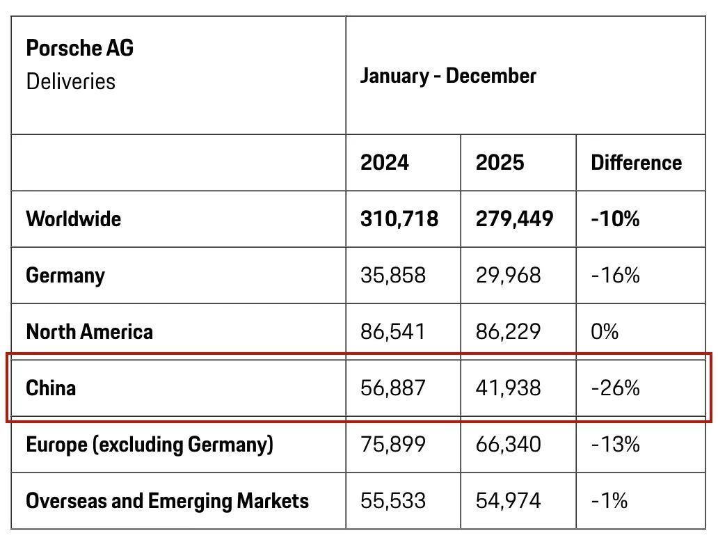 具体到中国市场,其表现不容乐观。过去一年,保时捷交付量为41938辆,同比大幅下降26%。公司解释称,销量下滑的核心原因主要是豪华汽车细分市场整体环境严峻,以及中国市场(尤其是纯电动车型领域)竞争加剧。保时捷表示,将继续在中国市场坚持“价值导向型销售”策略。