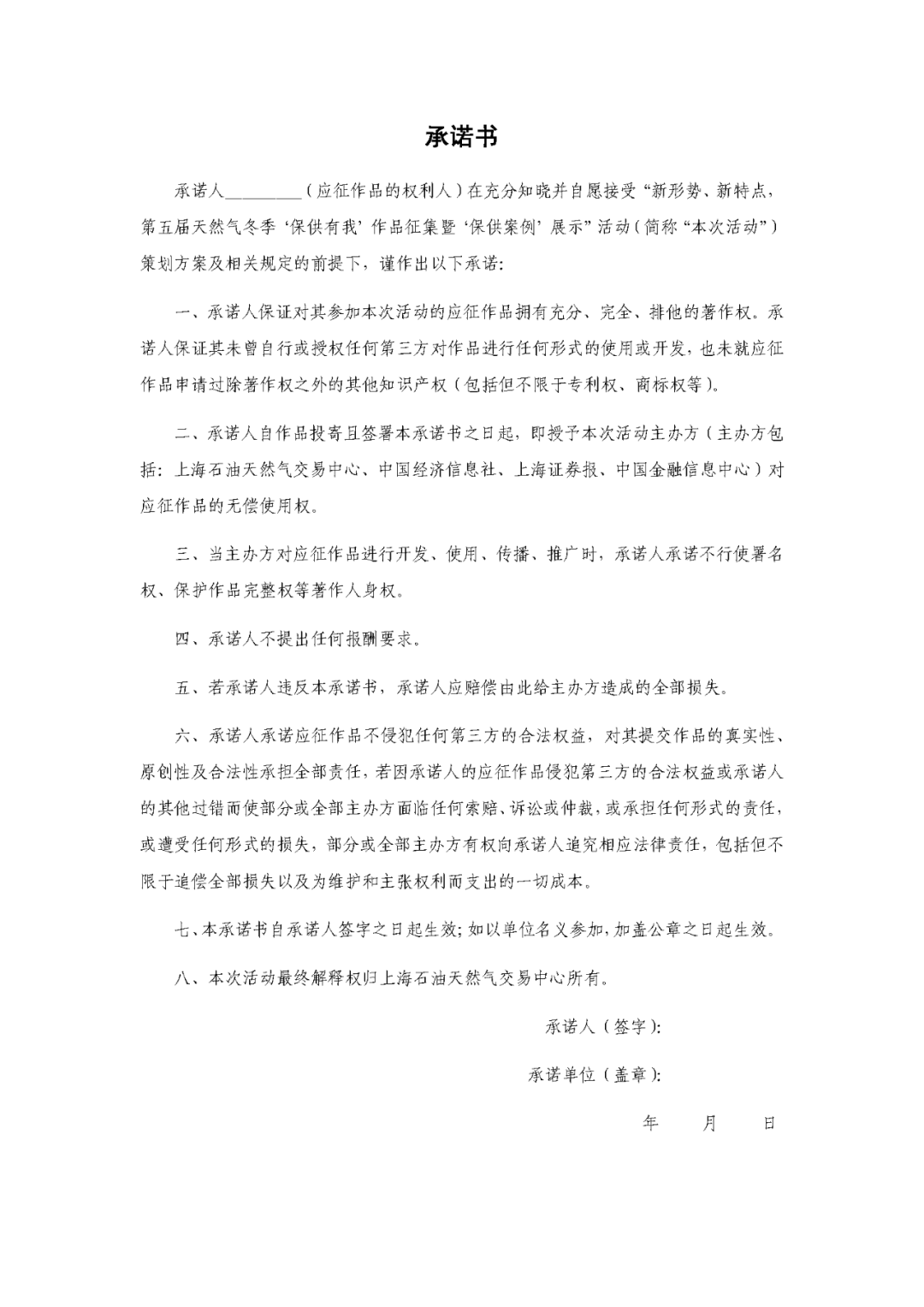 (四)参赛者授权主办方(主办方包括:上海石油天然气交易中心、中国经济信息社、上海证券报、中国金融信息中心)及转载渠道无偿使用作者名称或姓名及所在单位名称用于评选活动的组织、推广和宣传。