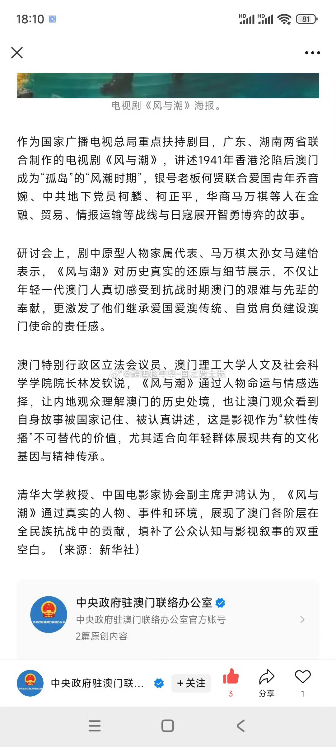 中央政府驻澳门联络办公室也发了风与潮研讨会新闻,任嘉伦这剧全是官方在夸,完美收官