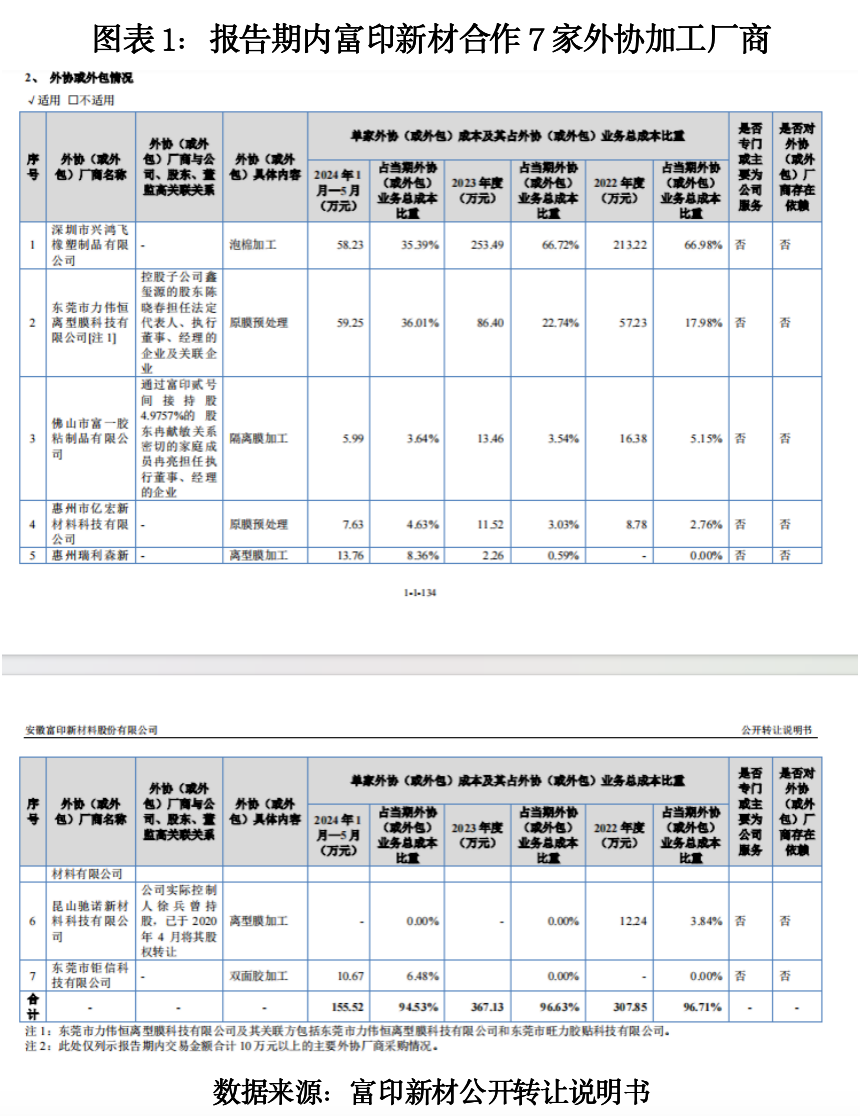 2024年12月,富印新材在新三板挂牌。挂牌的公开转让说明书显示,2022—2024年1—5月,富印新材存在与7家外协加工厂商合作的情形,其中东莞市力伟恒离型膜科技有限公司(下称“力伟恒”)、佛山市富一胶粘制品有限公司(下称“佛山富一”)、昆山驰诺新材料科技有限公司(下称“昆山驰诺”)3家为关联方外协厂商。