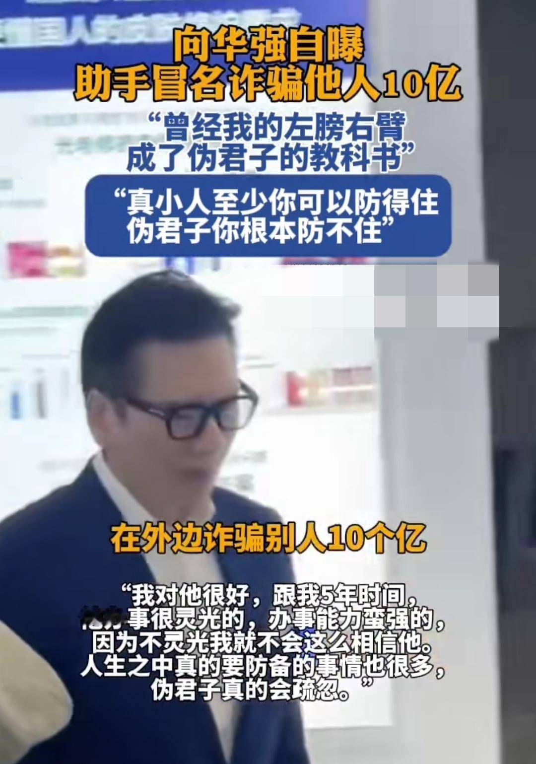谁能想到,被向华强捧为“左膀右臂”的助手,能在他身边藏5年,反手就搞出10亿诈骗? 这几天向华强自曝的内幕,直接戳中了所有人的“信任恐惧”——这位管着澳门财务的得力手下,平时办事灵光、深得器重,转头就冒名签公司、借老板名义搞庞氏骗局。 他直言这是“伪君子的教科书”:真小人明着坏,至少能防;伪君子揣着真心演忠心,根本防不住。自己掏心掏肺对他好,5年里没半分提防,结果对方把信任当行骗的“通行证”,这反差让不少人跟着揪心。 “宁交真小人,莫交伪君子”,这话一出口,不少网友都跟着共情:生活里那些看着靠谱的“自己人”,会不会也藏着别的心思?这事儿的来龙去脉还没全露出来,是非对错先不评,光这份“信任塌房”的冲击,就够让人琢磨半天了。 你说,要是身边有这么会装的人,到底该怎么辨得清?