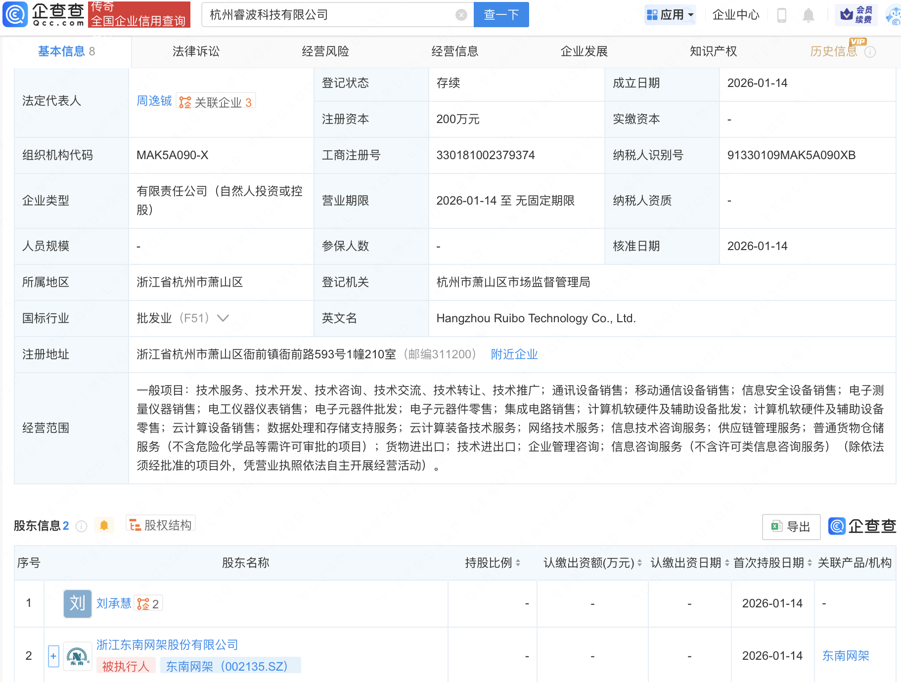 企查查APP显示,近日,杭州睿波科技有限公司成立,经营范围包含:移动通信设备销售;信息安全设备销售;电子元器件零售;集成电路销售等。企查查股权穿透显示,该公司由东南网架(002135)等共同持股。