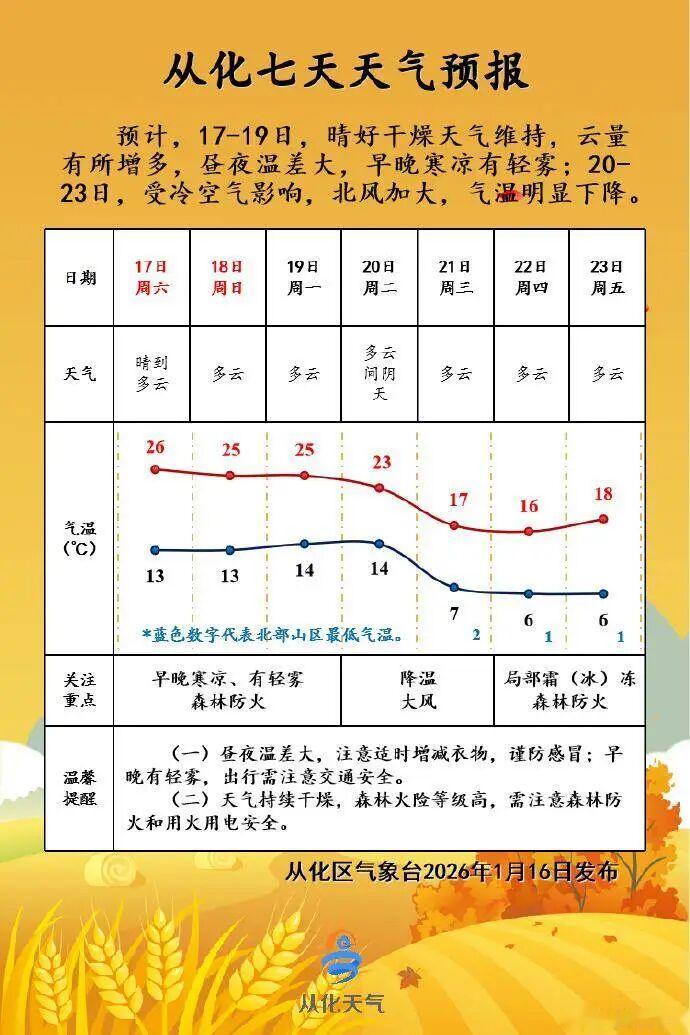 广州市从化区气象台1月16日发布的七天天气预报图/@从化天气