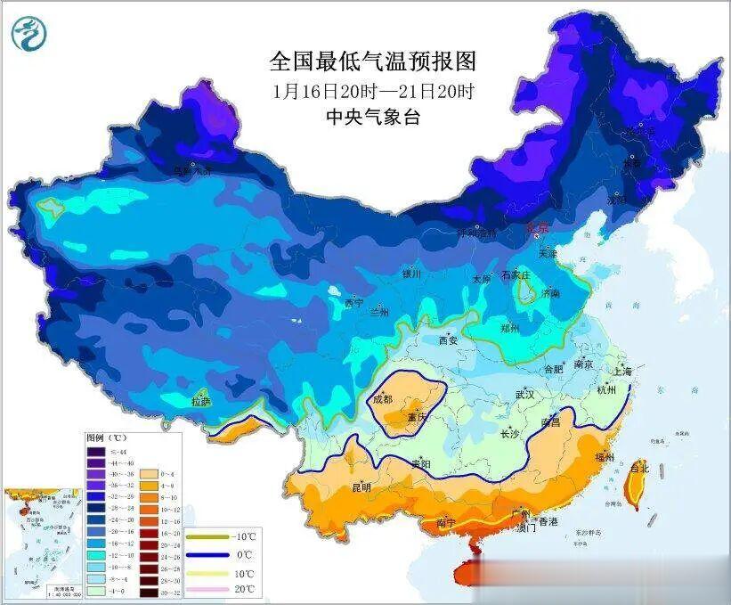 中央气象台1月16日20时至21日20时全国最低气温预报图