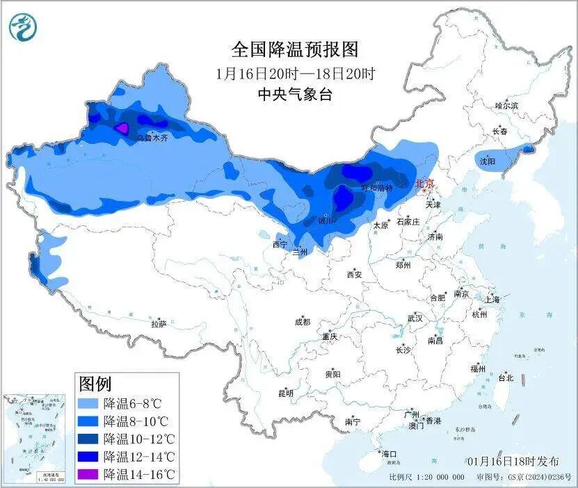 根据中央气象台的寒潮蓝色预警报文,受寒潮影响,1月17日至21日,我国大部分地区将自西北向东南出现降温大风,日平均或最低气温普遍下降6~12℃,黄淮、江淮、江汉东部、江南中西部及贵州东部、广西北部等地部分地区下降12~14℃,局地降温可达16℃以上。