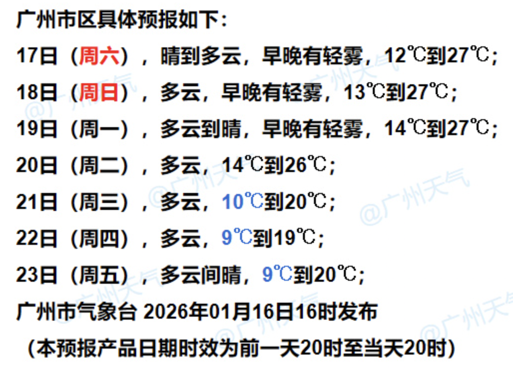 广州市气象台1月16日傍晚市区七天预报图/@广州天气