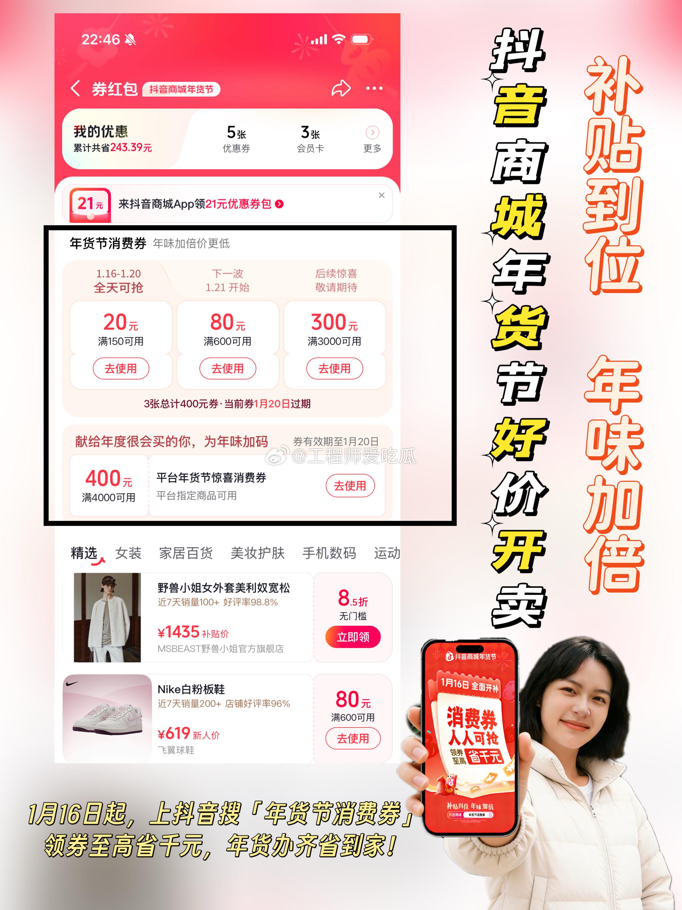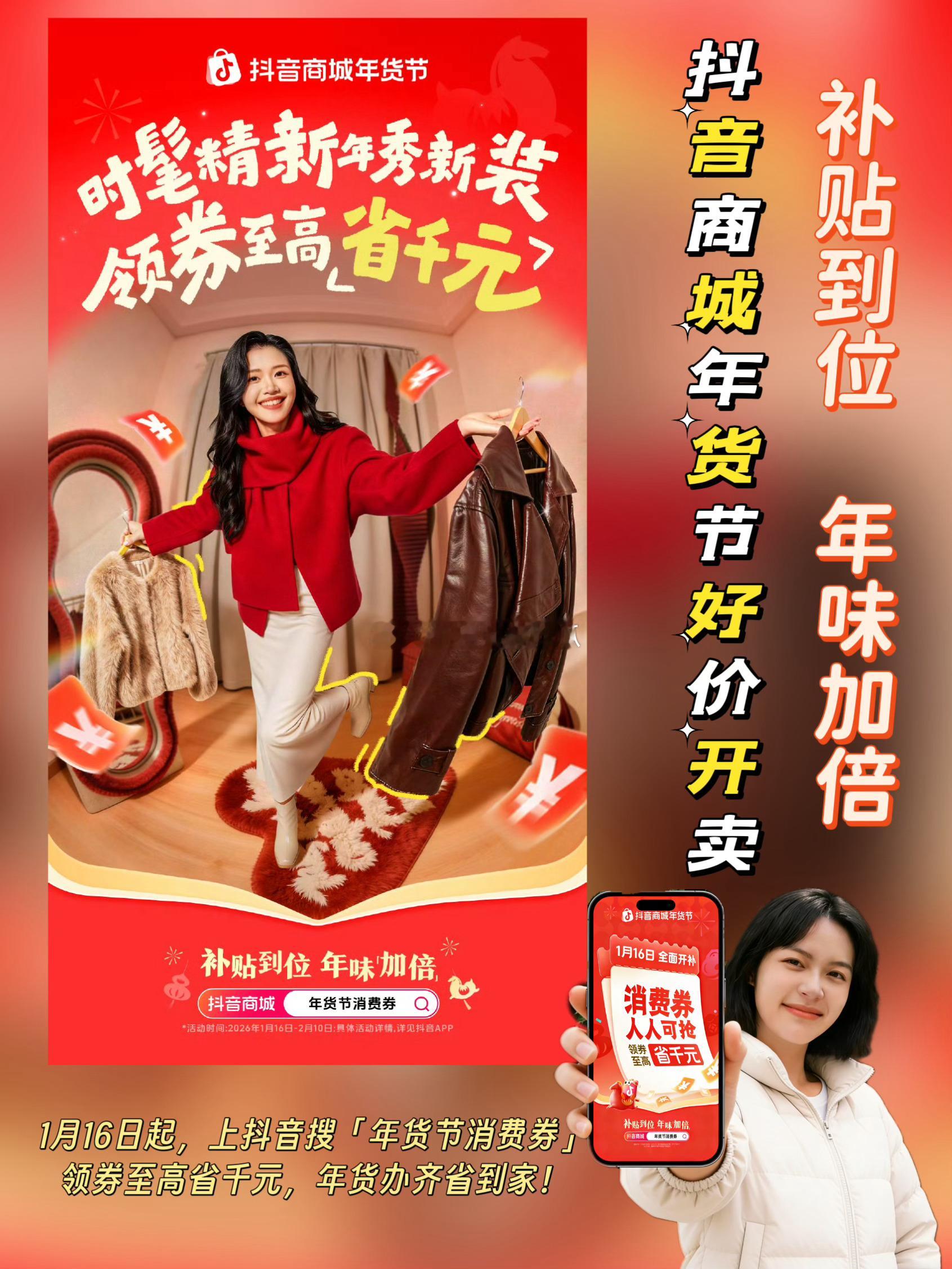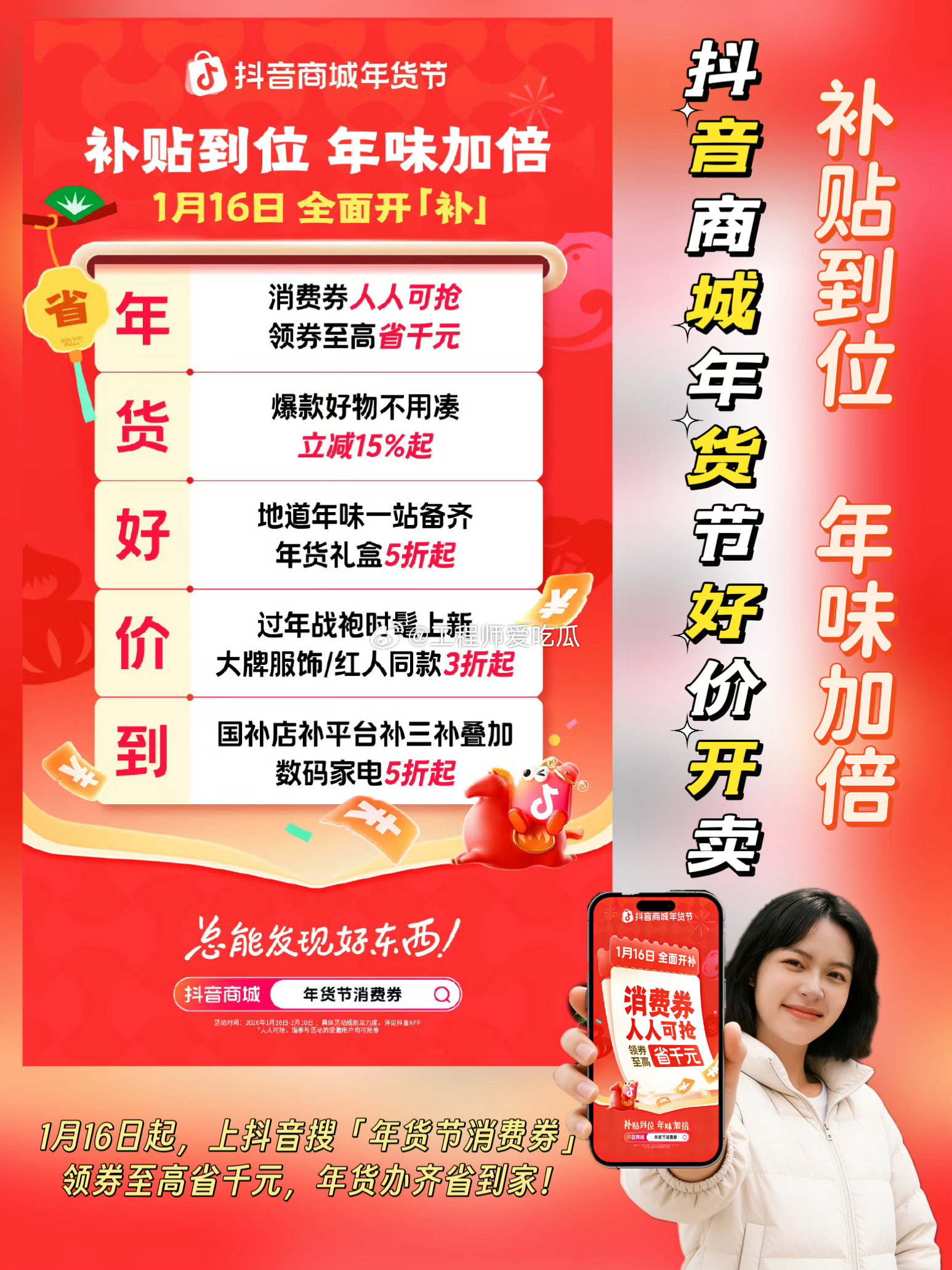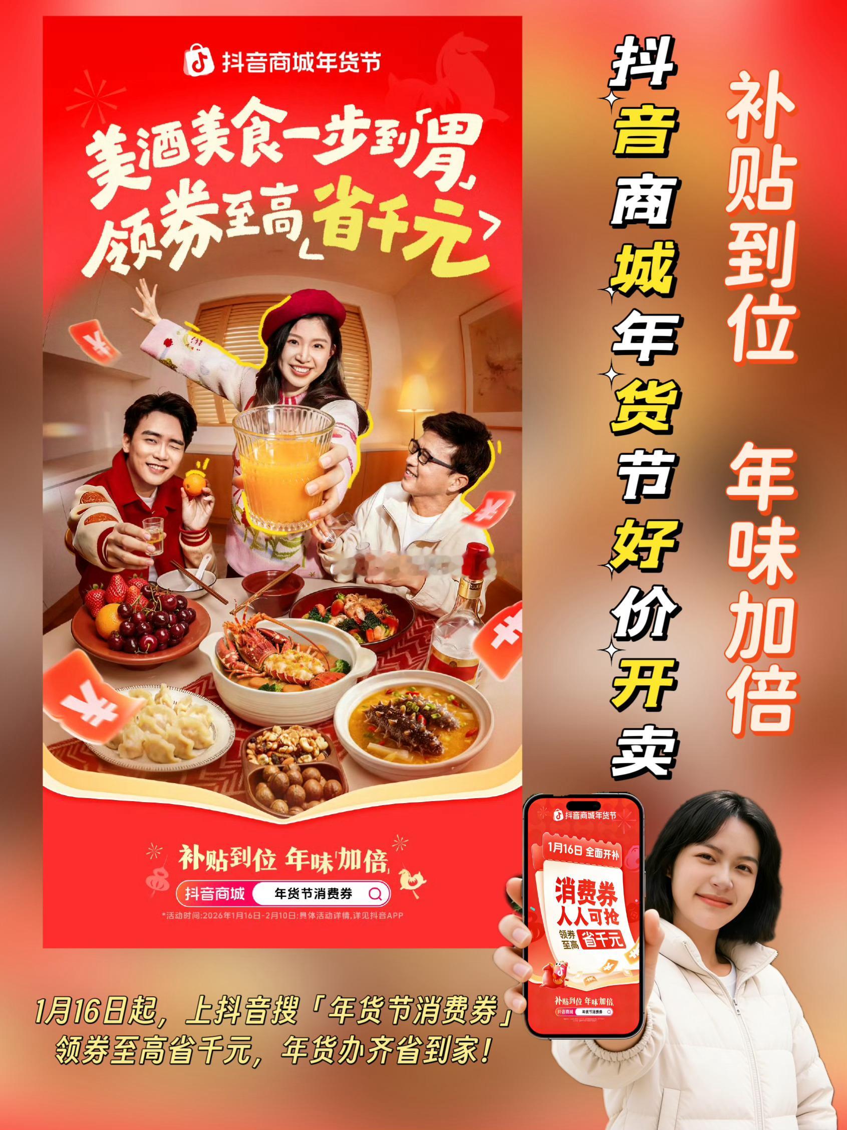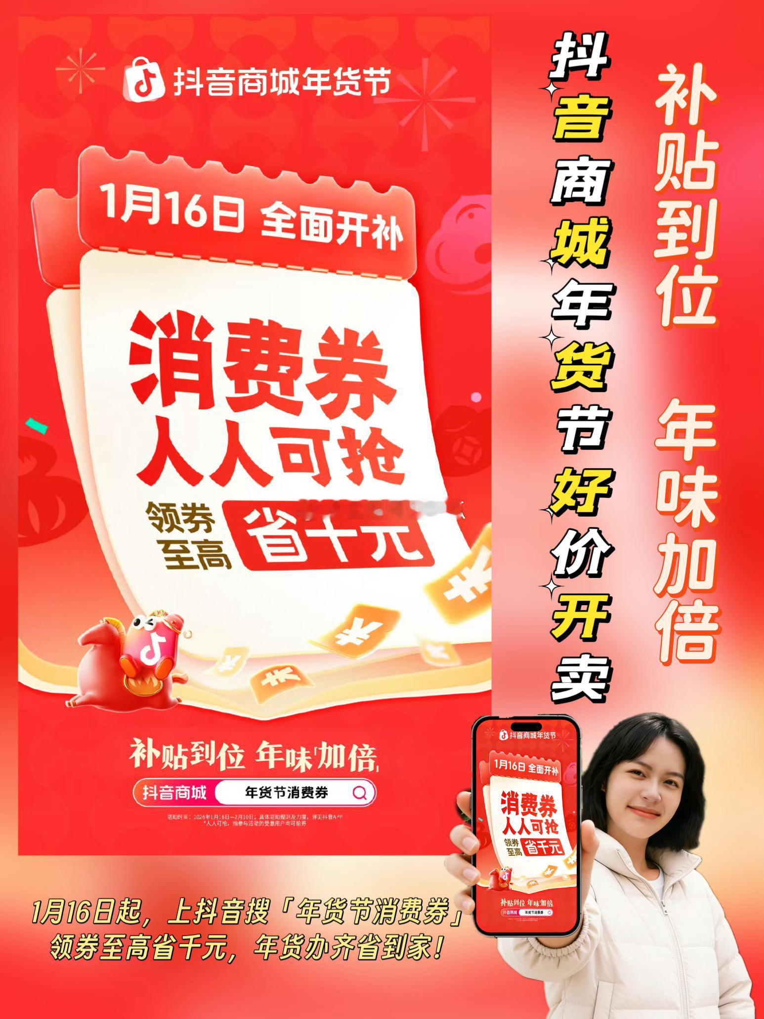 🎉年味渐浓,好礼登场!🎉瑞马送福,年货焕新!❤️时间过得好快,距离春节只剩不到一个月了。又到了每年给自己添置新衣、给亲朋好友买年货的时候了。抖音商城年货节好价开卖 抖音商城搜【年货节消费券】领券1月16日起,上抖音搜【年货节消费券】,年货好礼补贴加码,马上优惠!攒了一年的心意,都在年货里。一步到「胃」的美酒美食、时髦精的新年新装、孝敬爸妈的电子年货···愿你新年「马上」皆如意~拜年更有型的新年新装、聚会更尽兴的美酒美食···✅消费券人人可抢,领券至高省千元✅爆款好物不用凑,立减15%起✅地道年味一站备齐,年货礼盒5折起✅过年战袍时髦上新,大牌服饰/红人同款3折起✅国补店补平台补,三补叠加,数码家电5折起✅扫尘净舍迎新春,个护清洁6折起🛍️买年货来抖音商城,平台加补价更低,想要的年货「券」办齐抖音商城又发福利啦,工程师我一键领取到了好多优惠券,终于能把想要买的年货一次备齐啦,快看看工程师我都是怎么省钱的吧!✅燕之屋鲜炖燕窝原价5376,使用抖音年货节消费券后满4000-400到手4967元,足足省了400元。这知道这个牌子的燕窝平时根本不打折,赶紧买下单给妈妈囤一份,抖音商城真的没有套路啊,诚意满满折扣。✅波司登羽绒服原价2479元,使用抖音年货节消费券满600-80再叠加地方补贴,到手价只要2327元,净省152元。忙了一年了,之前一直都舍不得买这个牌子的羽绒服,这次在抖音商城刚好有活动,终于有理由买个自己了!✅苹果17promax原价9999元,使用抖音年货节消费券+地方政府补贴,到手只要9499,净省500元。之前我把一直说手机掉电快、内存不够,这次趁着抖音的年货节活动,终于可以给他换个新手机了。✅兰蔻抗老紧致礼盒原价2620,使用抖音年货节消费券满600-80,到手只要2540,足足省了80元,这也太划算吧。赶紧买了2套,准备过年走亲戚的时候给姐姐也安排上。这次年货在抖音买真的很划算。以上就是我这次购入的心头好物和省钱攻略,从大牌服饰3折起,到美妆低至5折起,再到家电数码换新5折起⋯抖音商城将实实在在的优惠给到了大家,领券即享终极好价,福利直接拉满!小伙伴们快来抖音搜索【年货节消费券】,领取专属优惠,把岁末心仪好物打包带走吧!1月16日起,上抖音搜【年货节消费券】,年货好礼补贴加码,马上优惠!✅消费券人人可抢,领券至高省千元✅爆款好物不用凑,立减15%起✅地道年味一站备齐,年货礼盒5折起✅过年战袍时髦上新,大牌服饰/红人同款3折起✅国补店补平台补,三补叠加,数码家电5折起✅扫尘净舍迎新春,个护清洁6折起🛍️买年货来抖音商城,平台加补价更低,想要的年货「券」办齐