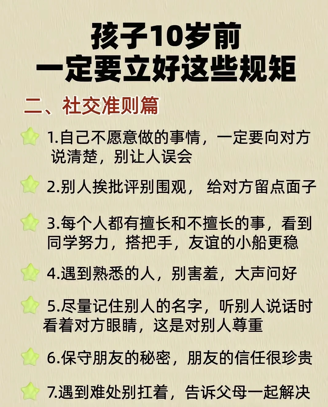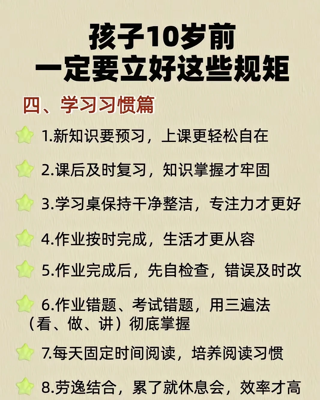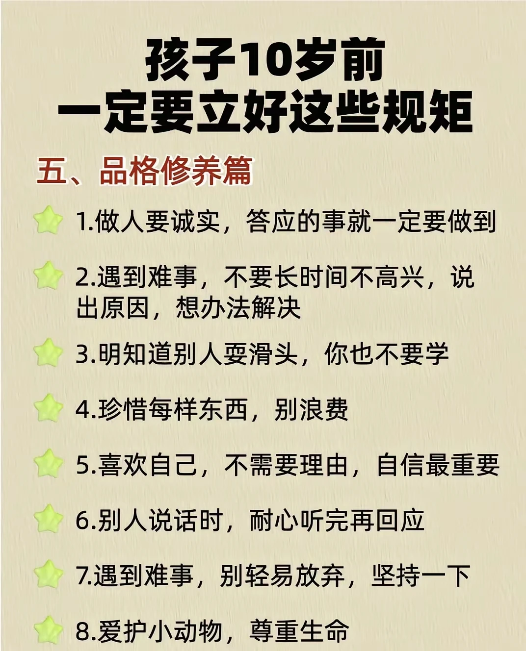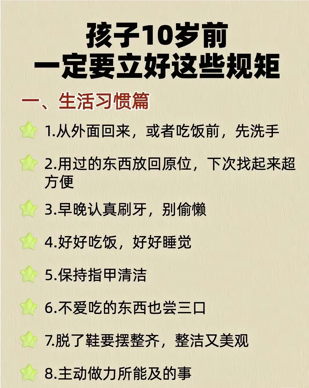一、生活习惯篇 1.从外面回来,或者吃饭前,先洗手 2.用过的东西放回原位,下次找起来超 方便 3.早晚认真刷牙,别偷懒 4.好好吃饭,好好睡觉 5.保持指甲清洁 6.不爱吃的东西也尝三口 7.脱了鞋要摆整齐,整洁又美观 8.主动做力所能及的事
