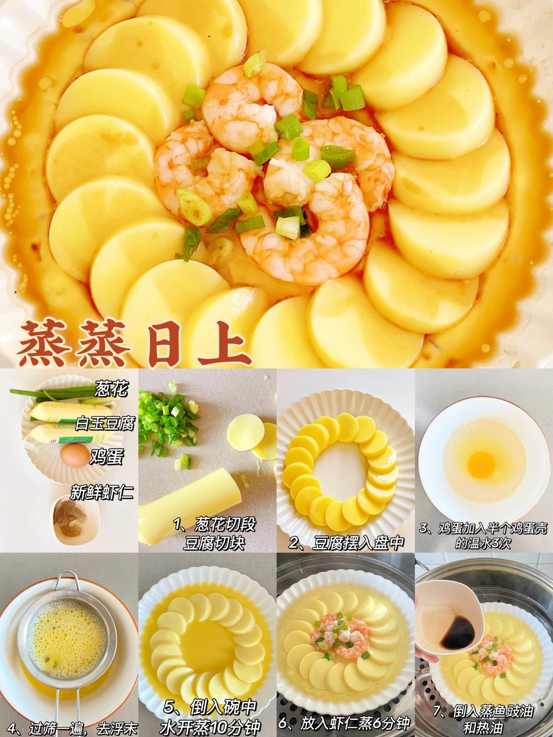 制作过程:葱花切段,豆腐切成片,鸡蛋打散加入三个半鸡蛋壳的温水,搅拌均匀,过筛一遍去浮末,倒入碗中,开水上锅蒸10分钟,放入虾仁继续蒸6分钟,最后撒上葱花,淋上蒸鱼豉油和热油
