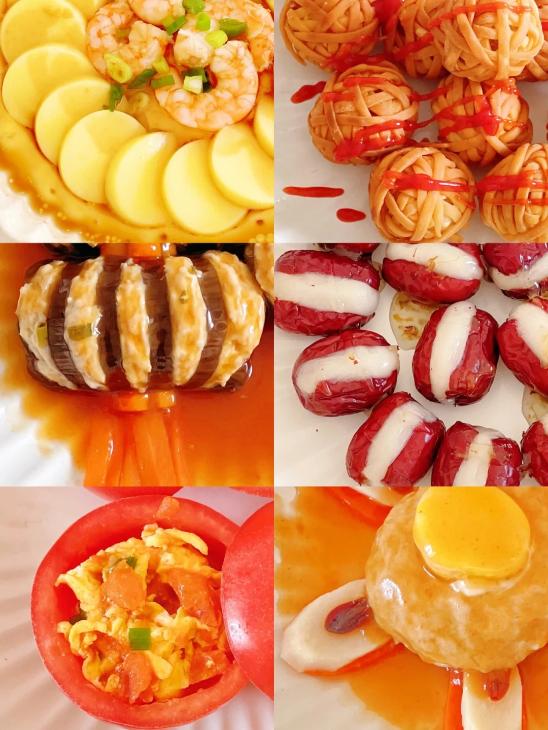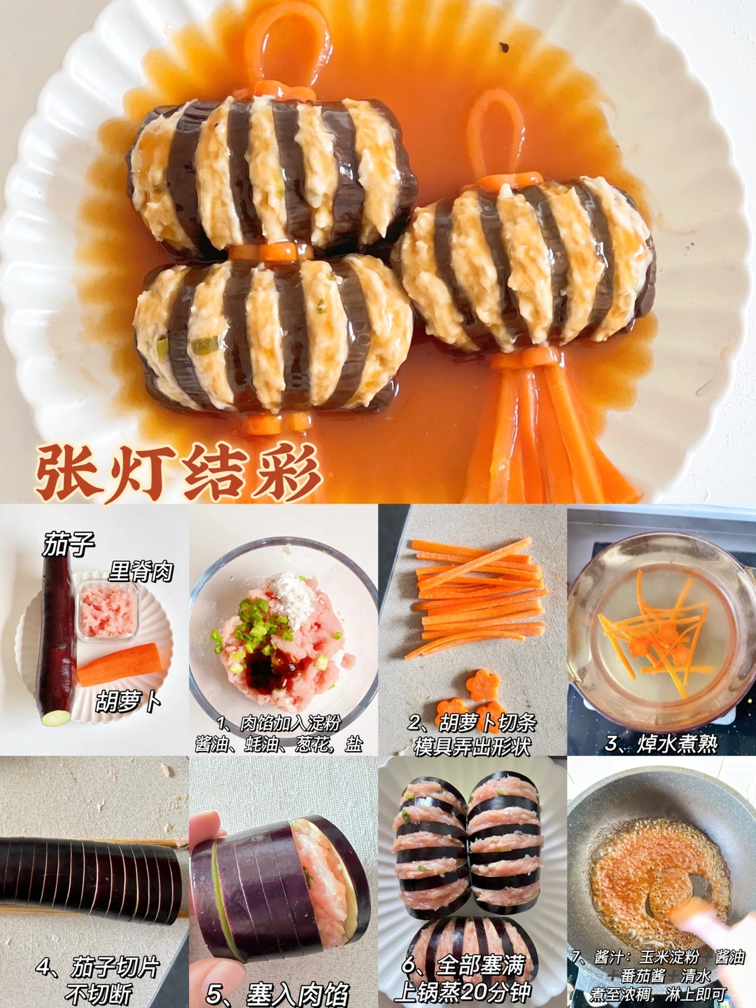 制作过程:茄子切成片不要切断,胡萝卜切成条和用模具按压出花型,里脊肉放入玉米淀粉➕酱油加盐➕葱花搅拌均匀,放入茄子片中塞满,上锅蒸20分钟,最后淋上酱汁即可