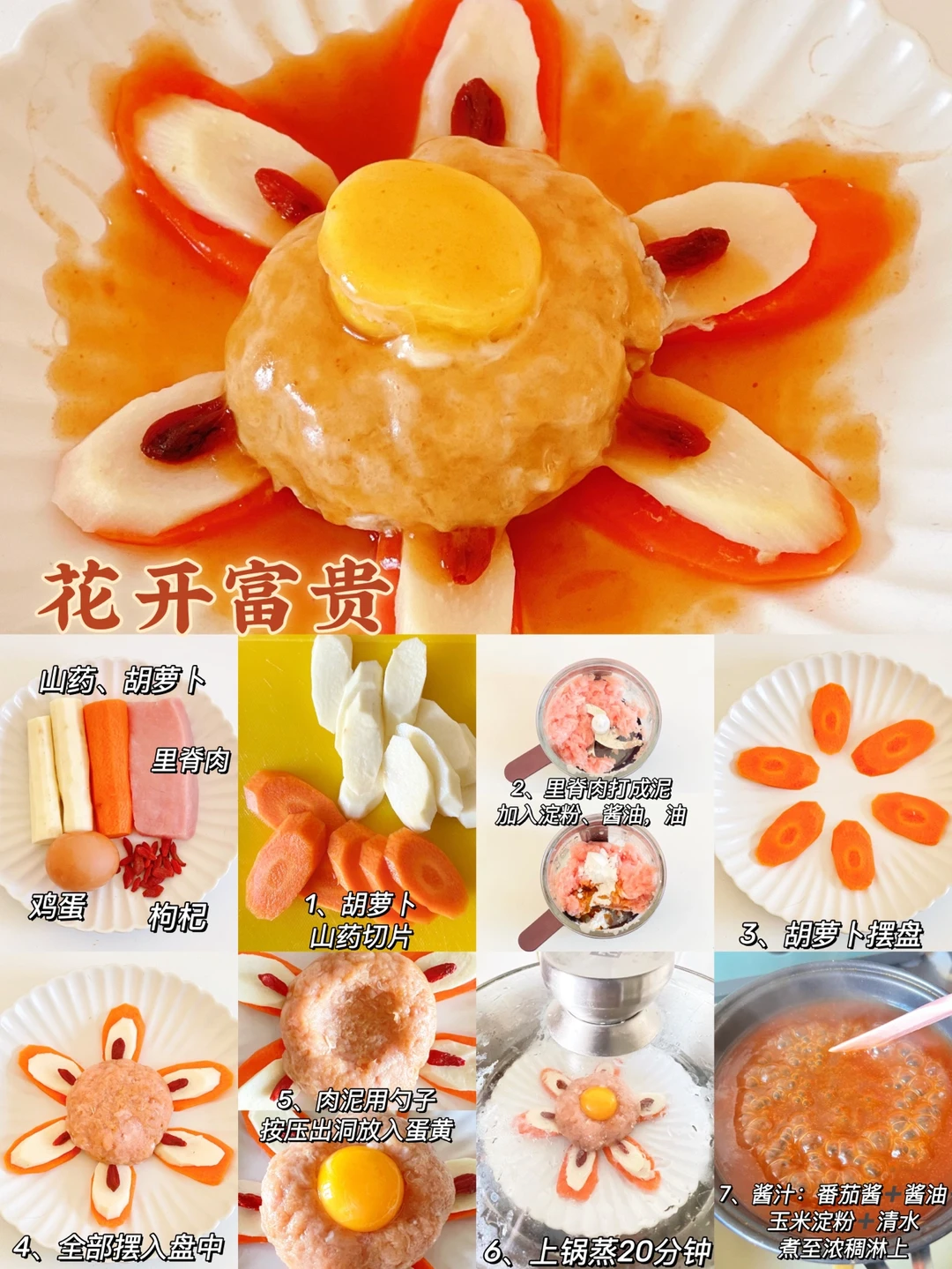 制作过程:胡萝卜山药切成片,里脊肉搅打成泥,放入玉米淀粉,酱油,油搅拌均匀,胡萝卜山药摆盘,最后放入肉泥用勺子按压出洞,放入蛋黄,上锅蒸20分钟