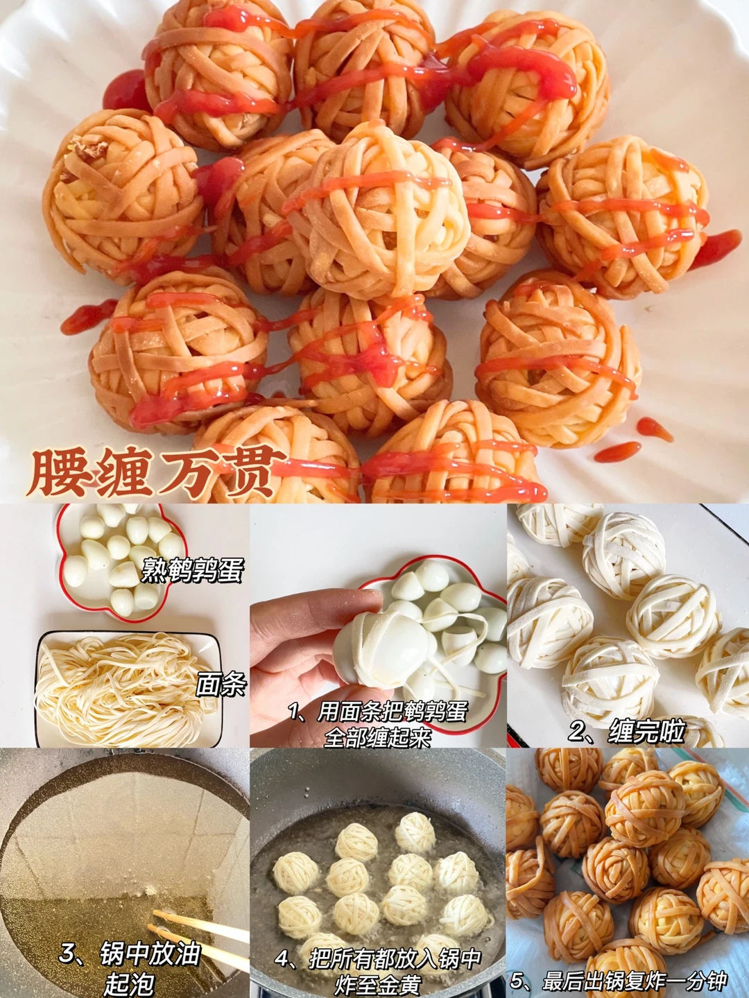 制作过程:鹌鹑蛋煮熟,剥壳,面条将鸡蛋全部缠起来,锅中放入油,烧至冒泡放入,炸至金黄色,再回锅复炸一分钟即可