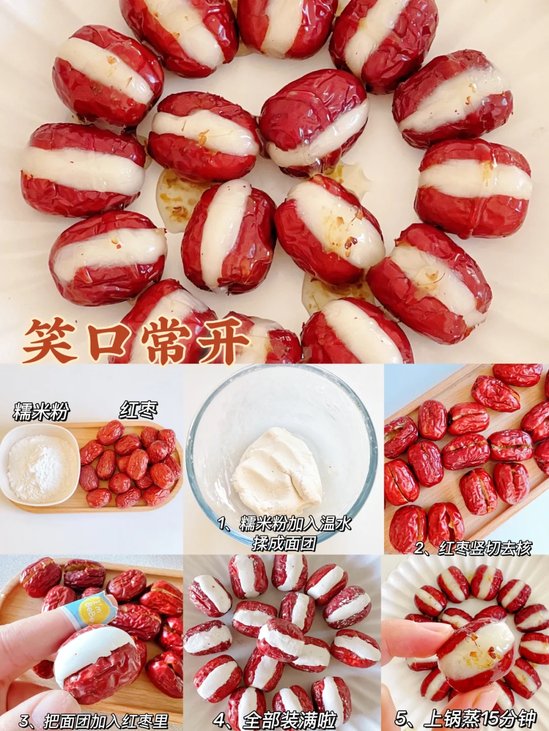制作过程:红枣竖切取出核,糯米粉加入温水揉成面团,将面团塞入红枣中,上锅蒸15分钟