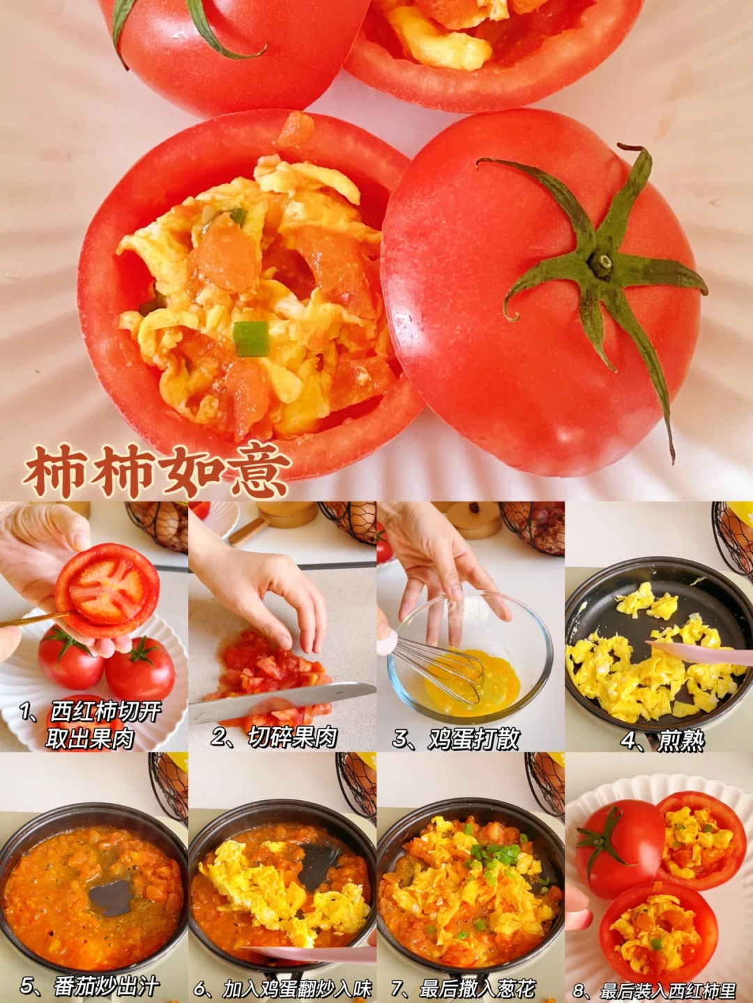 制作过程:西红柿切开取出果肉,切碎备用,鸡蛋煎熟,西红柿放入炒出汁放入鸡蛋翻炒入味,装入西红柿里即可
