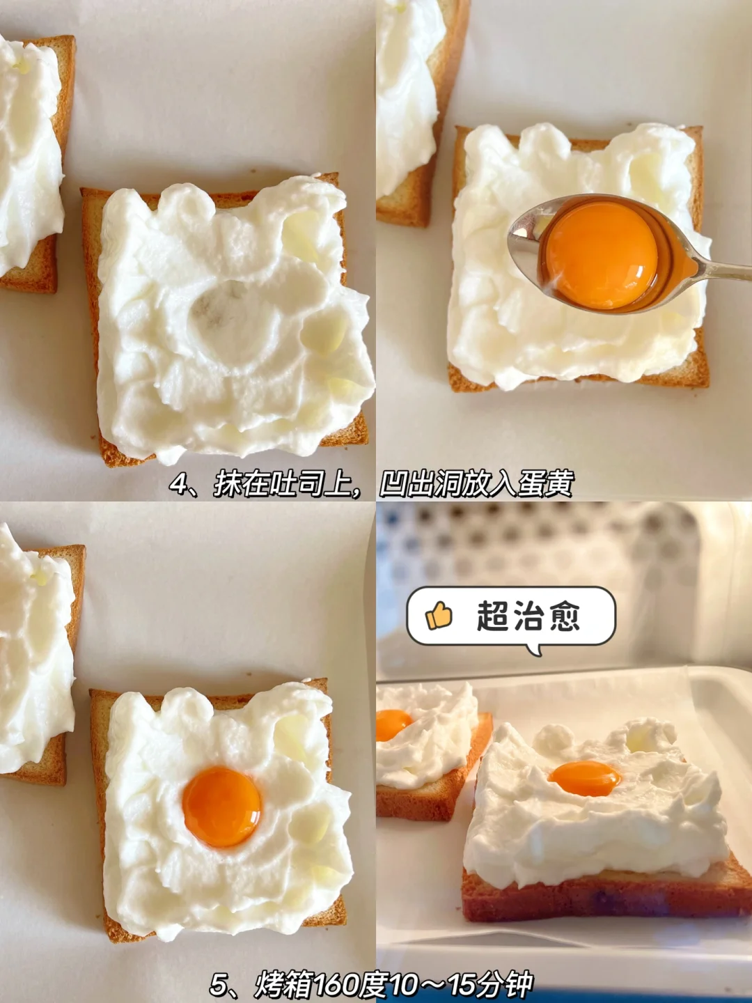 2、蛋白霜在烤好的吐司上面涂抹出云朵的样子,中间留一个洞放入蛋黄