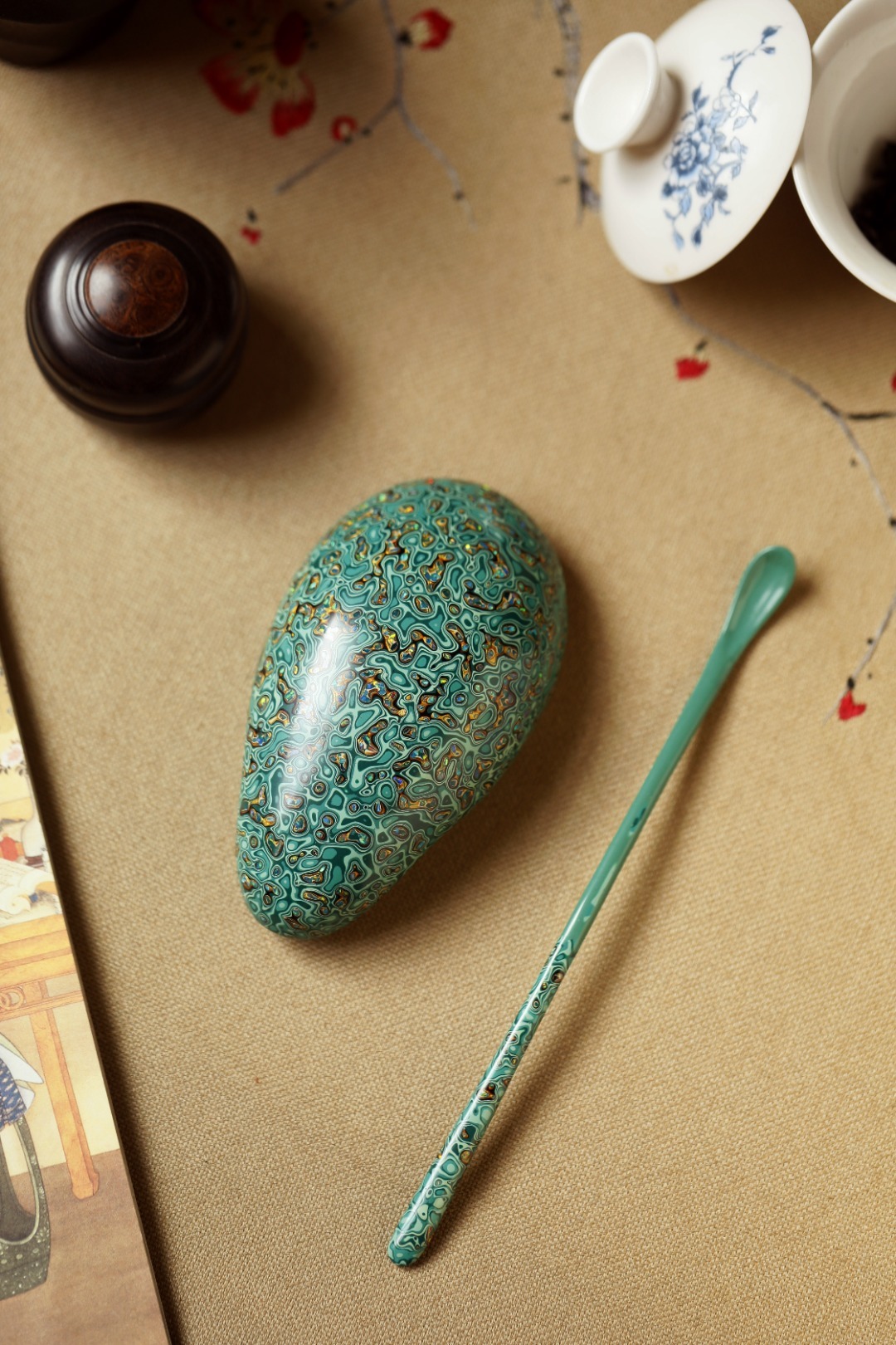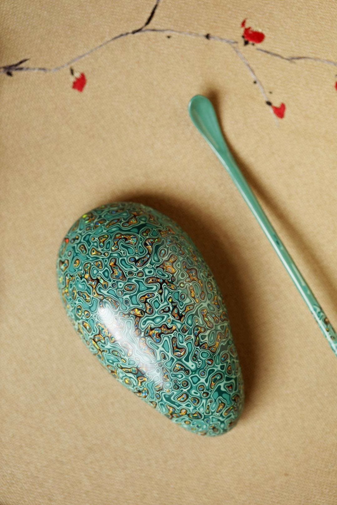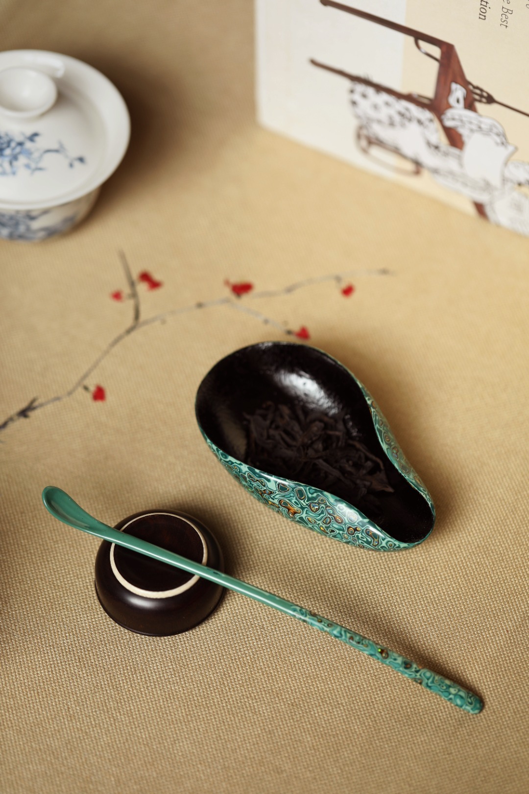 大漆【竹叶绿】茶则紫光檀为胎底,逐层髹漆,镶嵌多彩螺钿,斑斓多彩,反复推光打磨,触手温润细腻,辅以茶事,百观不厌。茶则:11.4*6.4*3.5cm茶勺:18cm 大漆【竹叶绿】茶则