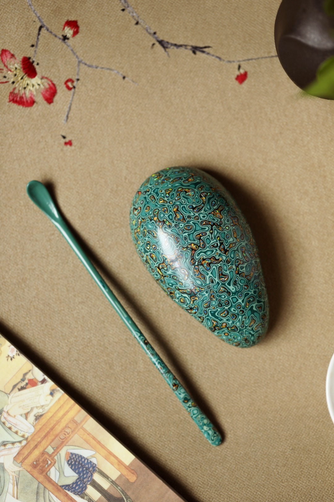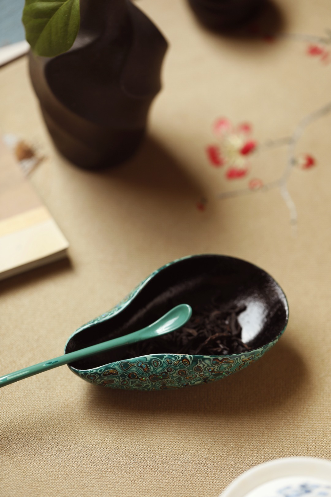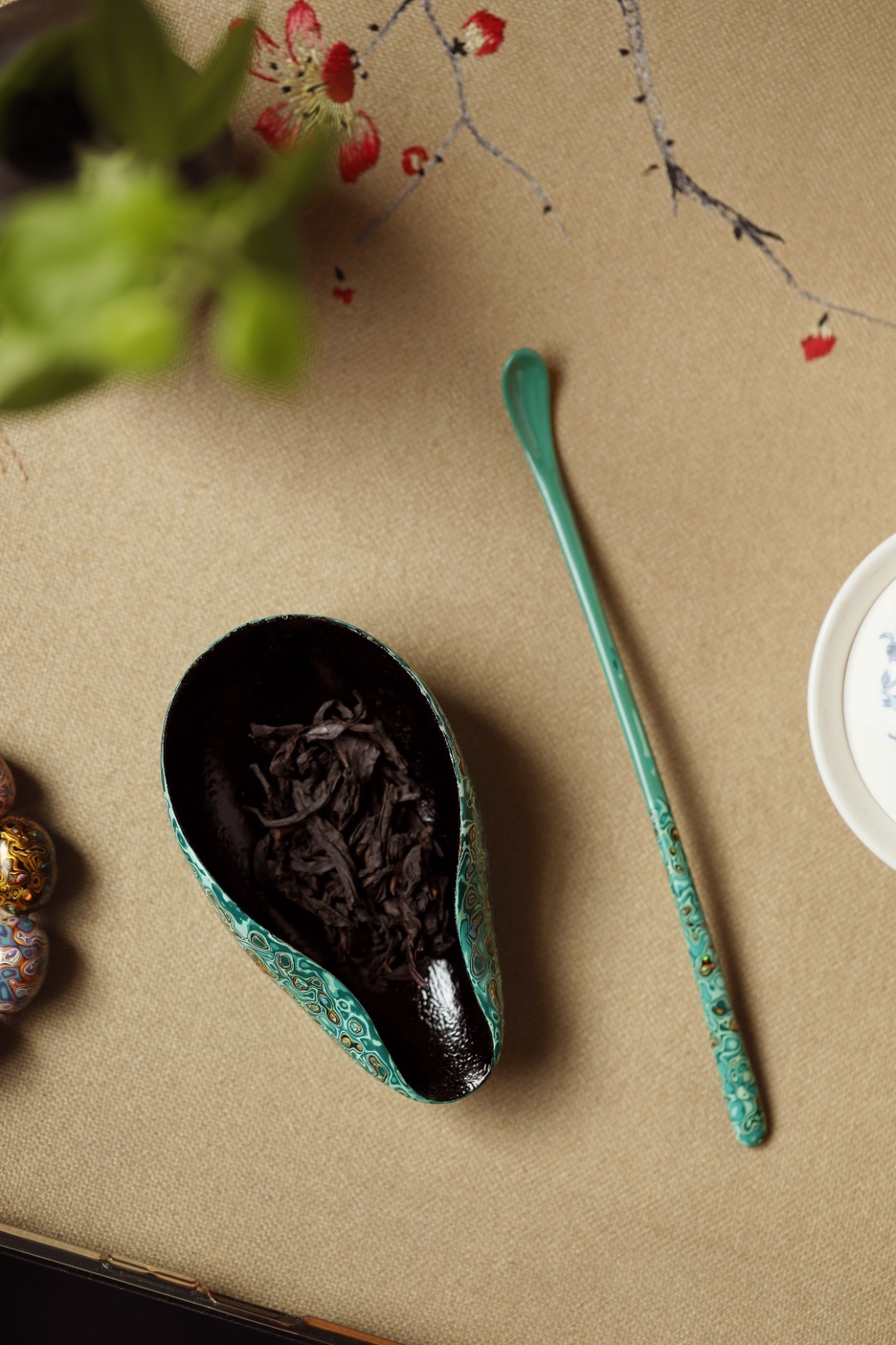 大漆【竹叶绿】茶则紫光檀为胎底,逐层髹漆,镶嵌多彩螺钿,斑斓多彩,反复推光打磨,触手温润细腻,辅以茶事,百观不厌。茶则:11.4*6.4*3.5cm茶勺:18cm 大漆【竹叶绿】茶则