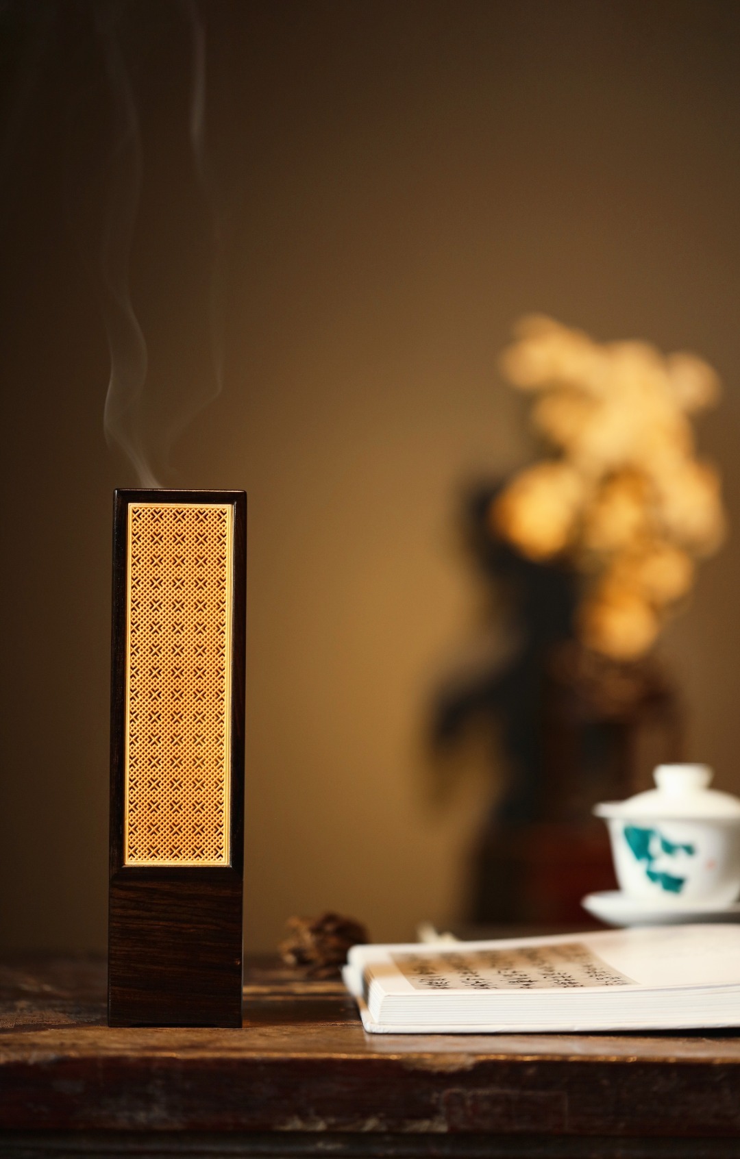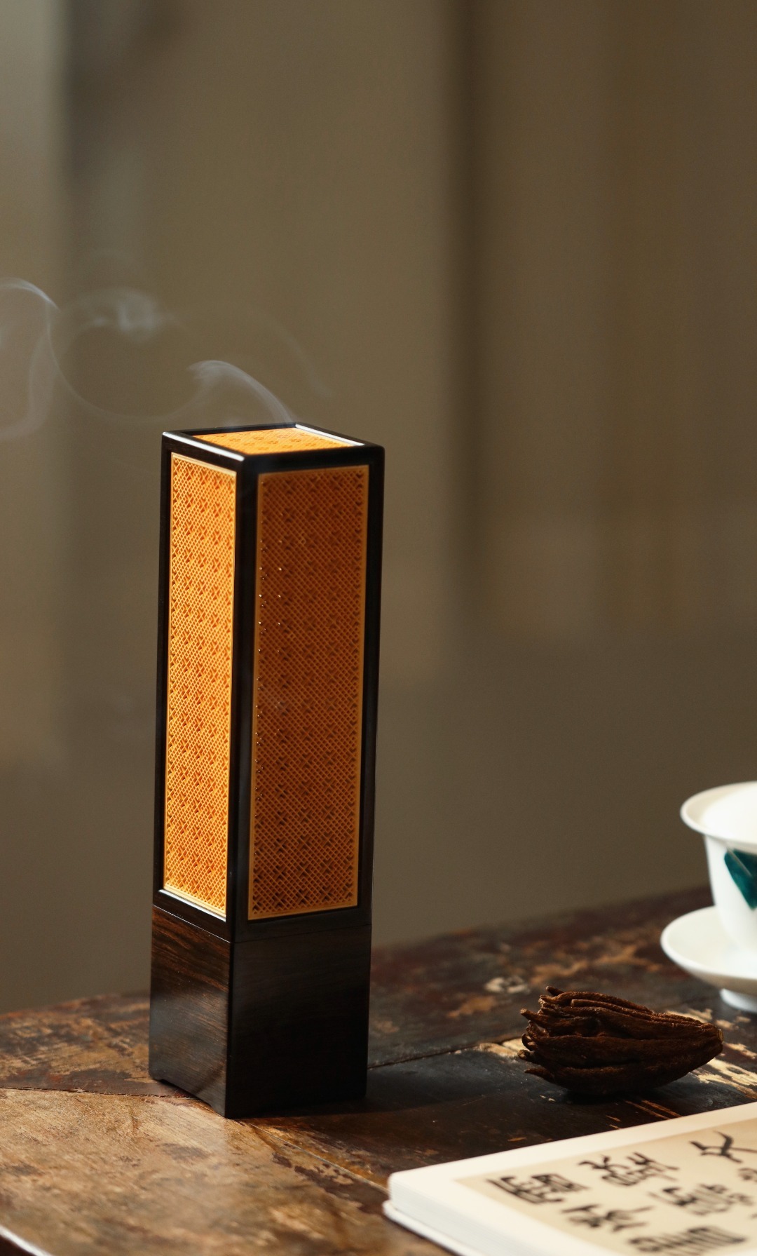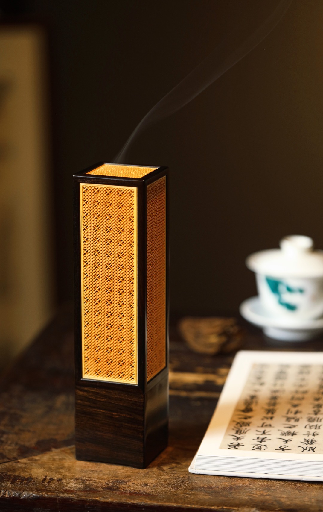 紫光檀×黄杨木 | 香炉经典手作,纯榫卯架构,透雕吉祥窗格纹;烟云缭绕,空间陈设