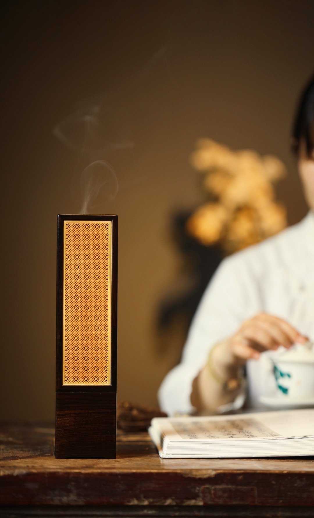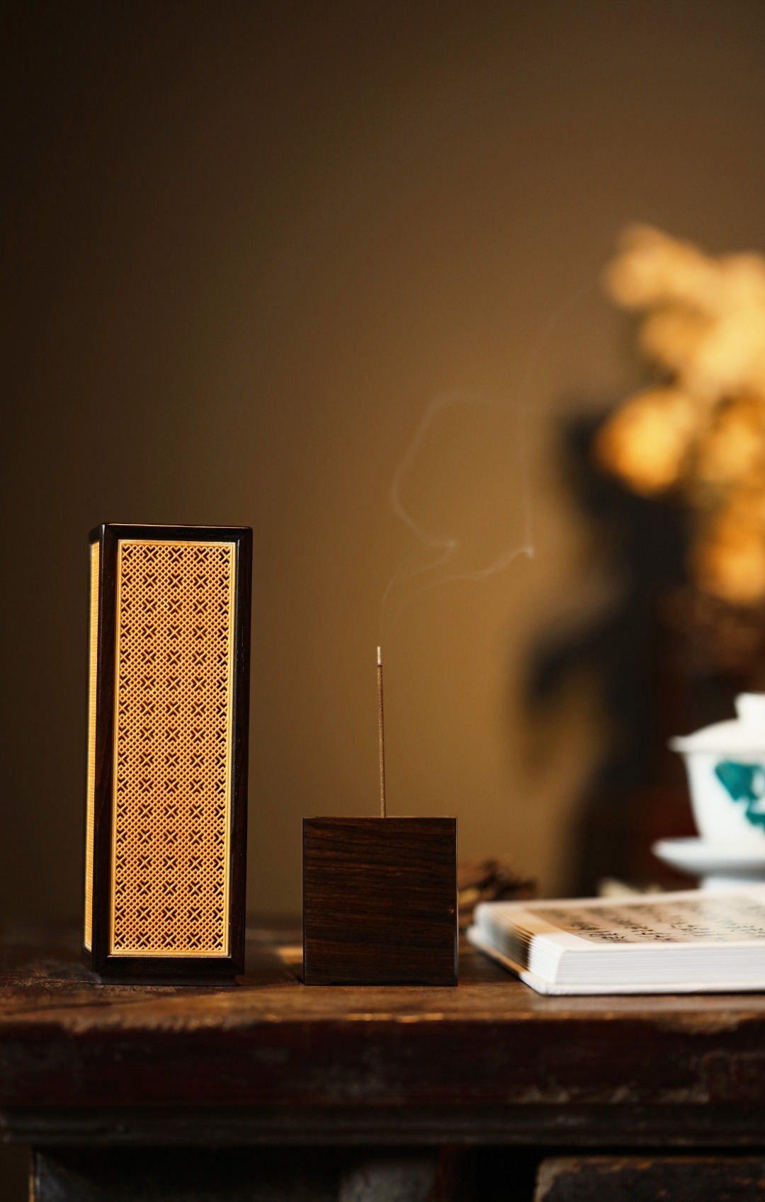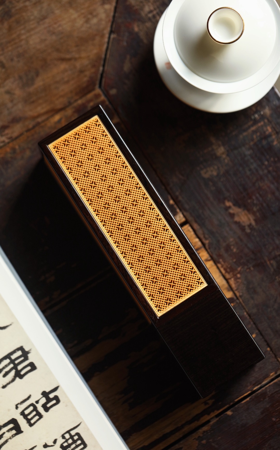 紫光檀×黄杨木 | 香炉经典手作,纯榫卯架构,透雕吉祥窗格纹;烟云缭绕,空间陈设