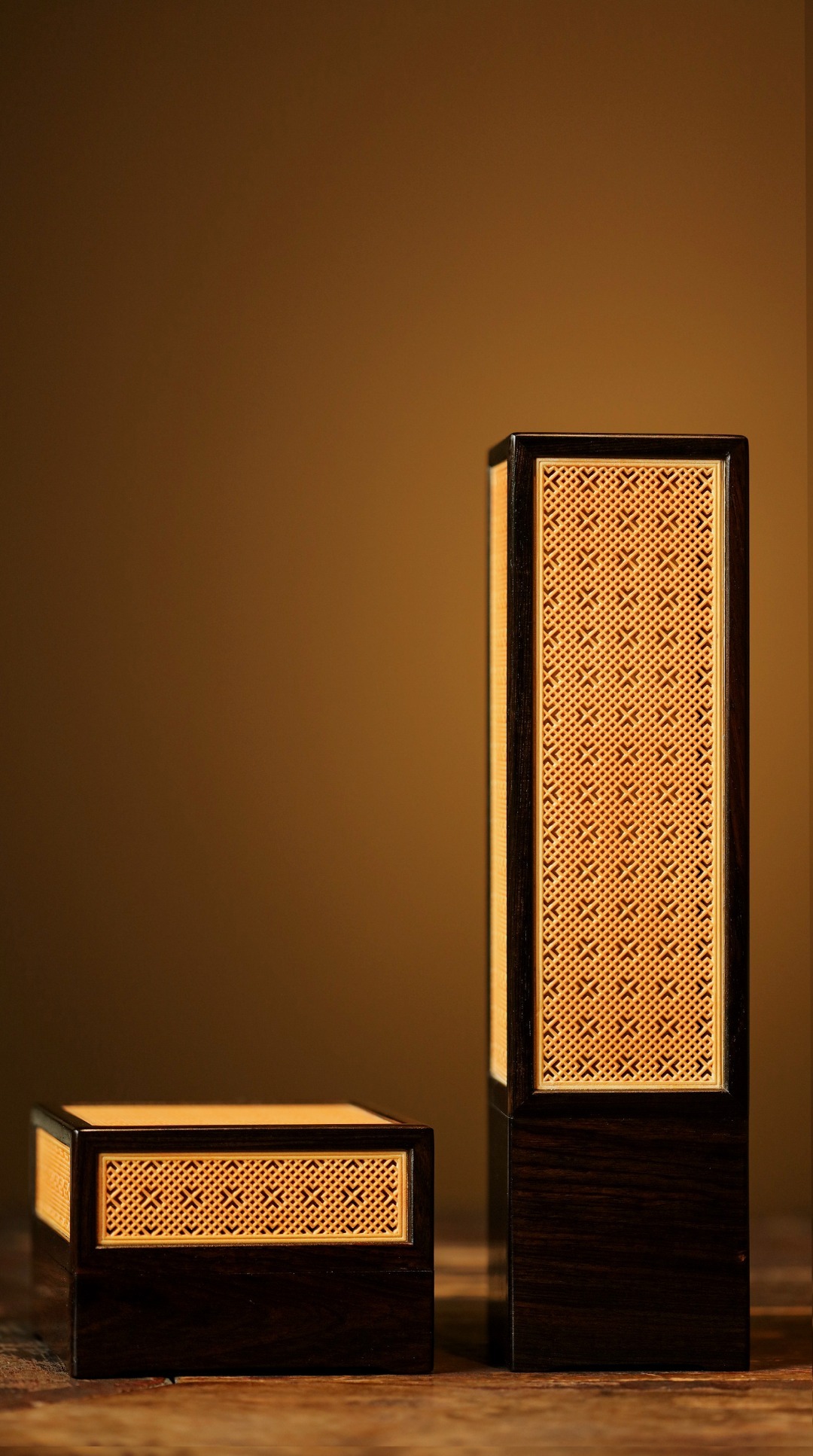 紫光檀×黄杨木 | 香炉经典手作,纯榫卯架构,透雕吉祥窗格纹;烟云缭绕,空间陈设,文雅非常。6*6*24cm 重206g 紫光檀X黄杨木 | 香炉