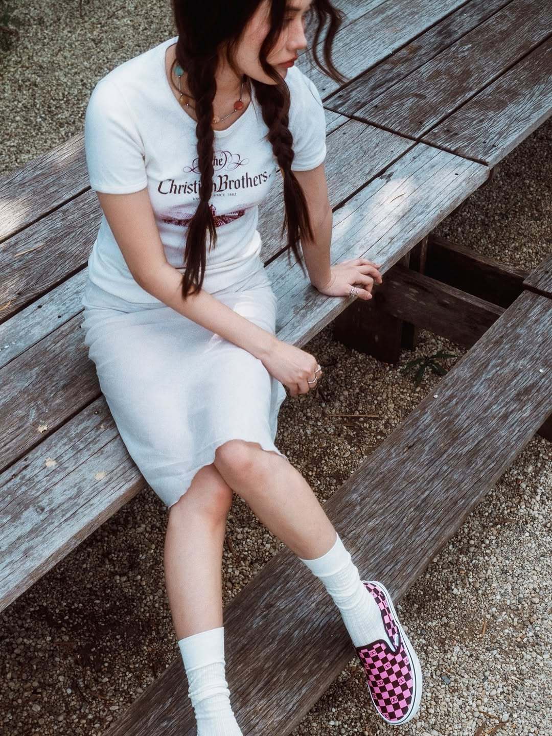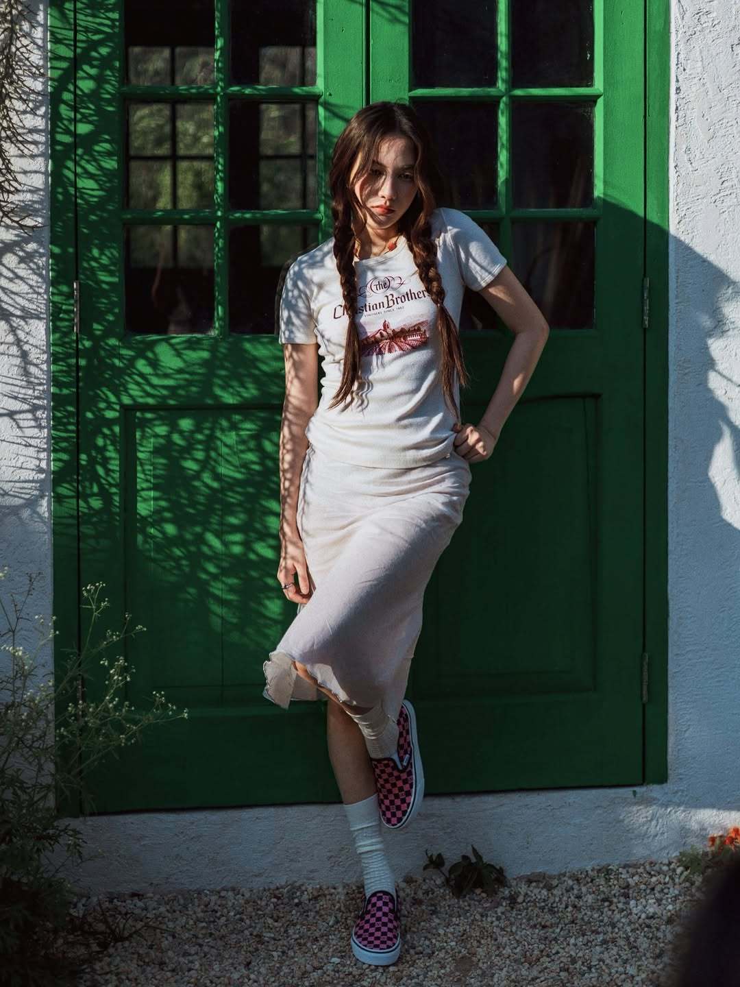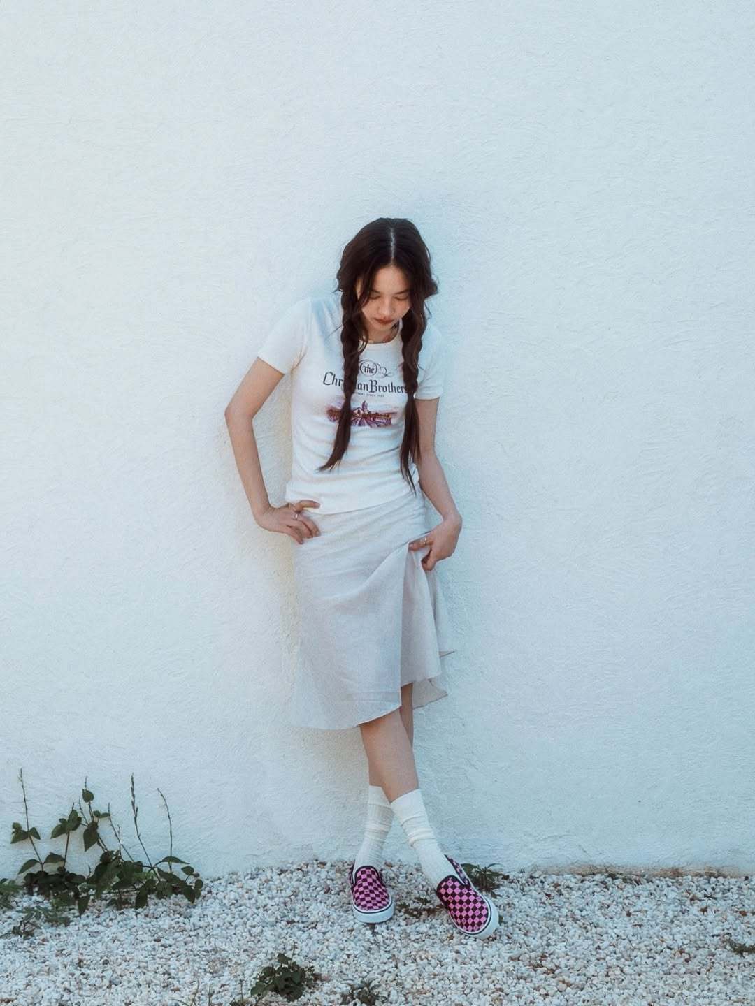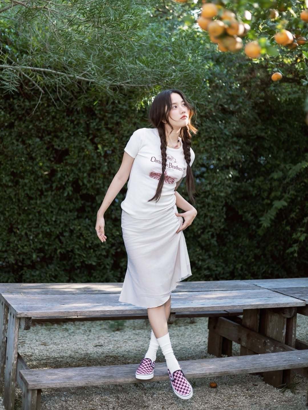 露台的松弛系少女白印花T恤搭浅蓝微喇裤,清爽得像山间的风~靠在木柱旁的慵懒