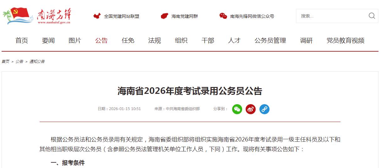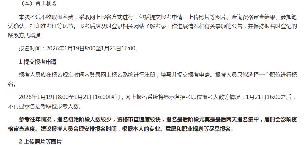 海南省2026年度考试录用公务员,报名时间:2026年1月19日8:00至1月23日16:00。参考往年情况,报名初始阶段人数较少,资格审查速度较快,报名最后阶段尤其是最后两天报名集中,届时会影响资格审查速度。建议报考人员合理安排报名时间,根据本人的专业、意愿和职业规划等尽早报名。