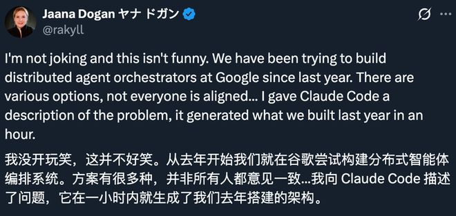 Google首席工程师JaanaDogan发了一条推文,大意是她让ClaudeCode处理一个问题,结果它在一小时内生成了她团队花一年时间才完成的东西。这条推文获得了超过800万次浏览。