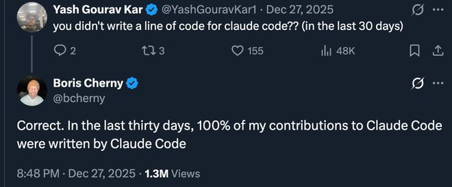 但最让人震惊的是ClaudeCode创造者BorisCherny自己说的话。他在推特上公布了一个数据:30天内,他对ClaudeCode代码库的所有贡献,100%都是由ClaudeCode自己编写的。4万行新代码,259个PR,全部出自AI之手。