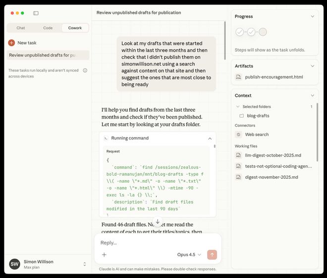 SimonWillison自己也做了个实验。他没让Claude写代码,让它检索自己博客三个月内的草稿,确认哪些还没发布过,然后推荐最接近完成的几篇。Claude执行了44次独立搜索,最后给出了排序建议。