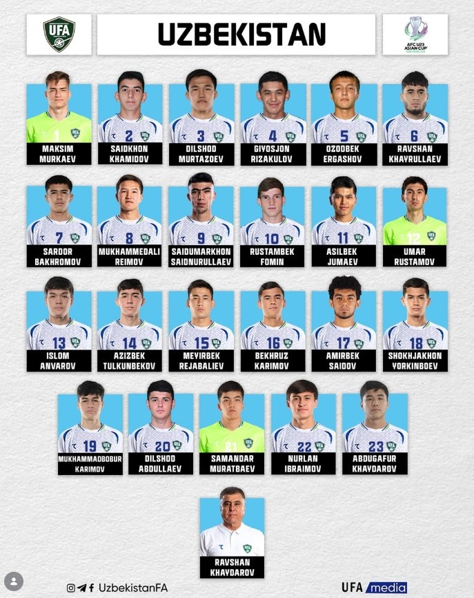 乌兹主教练是2002-2004年执教过国家队的老帅海达洛夫,此前曾多次执教乌兹U19和U23队,先后获得2018年U23亚洲杯和2023年U20亚洲杯冠军。这次参加U23亚洲杯杀入8强的乌兹,因俱乐部不放人,加上要备战2028年奥运会,包括胡萨诺夫(曼城)、费祖拉耶夫(伊斯坦布尔谷穗城)等适龄球员在内都没来,海达洛夫带领的实际上是U21队。