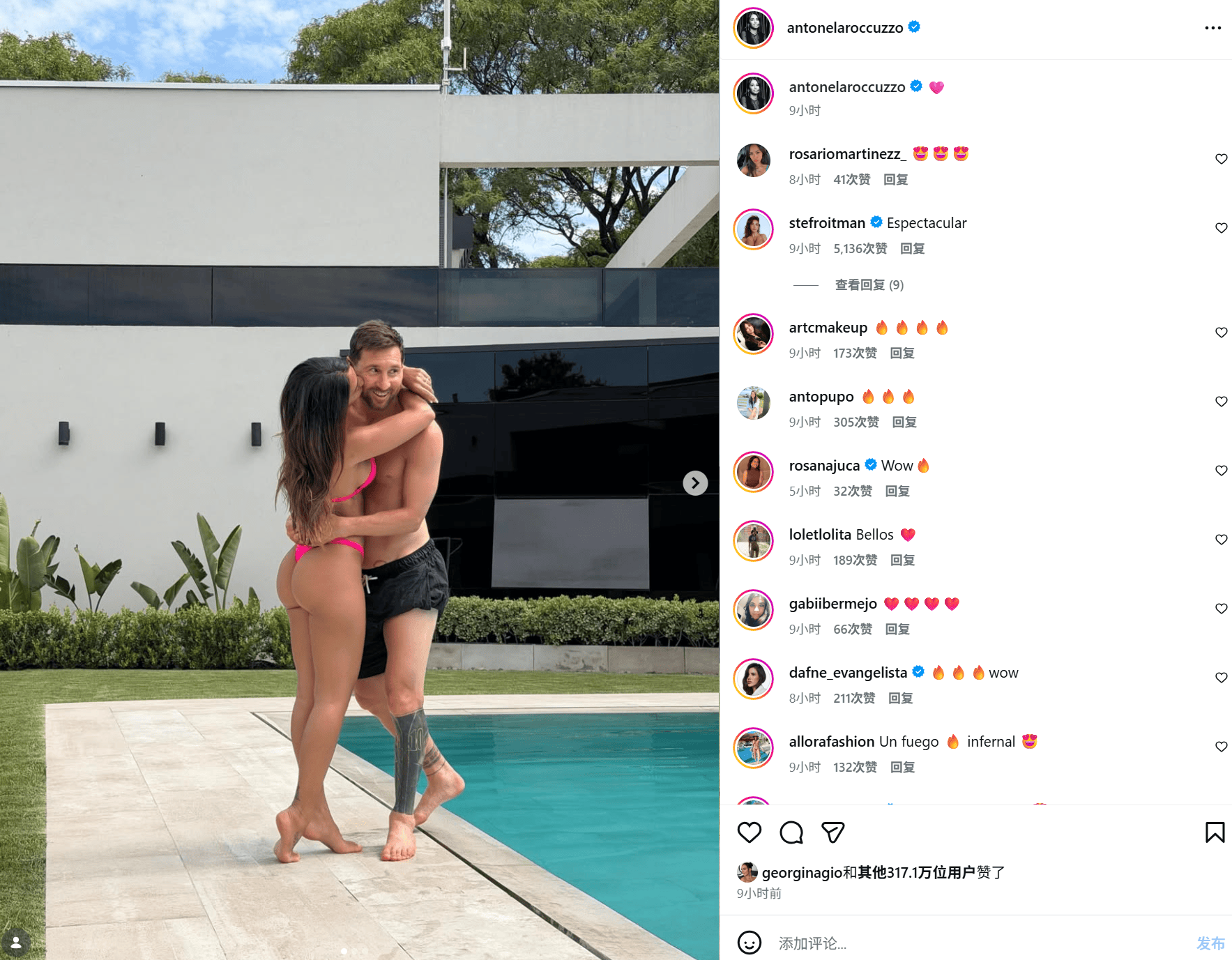 撒狗粮了!安东内拉社媒晒照,她穿比基尼在泳池边亲吻梅西