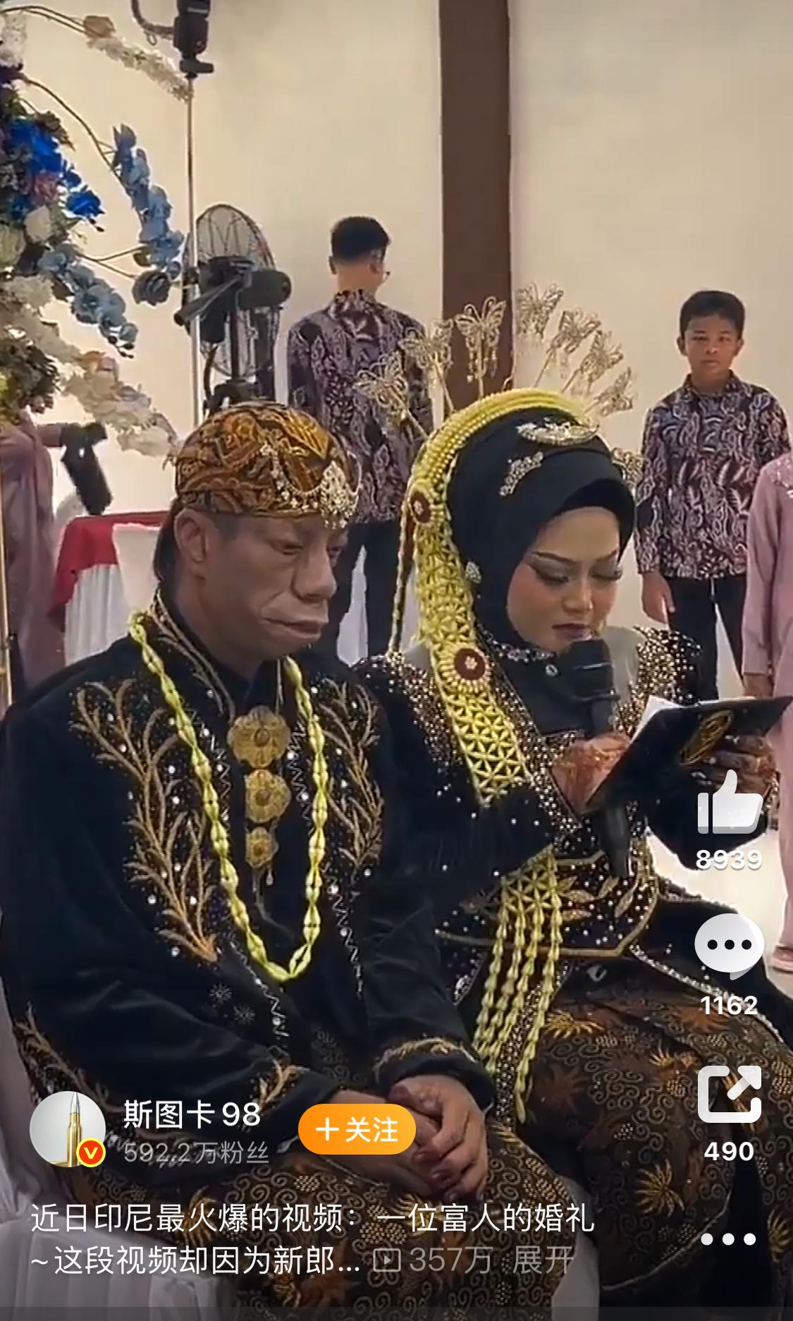 这是印尼2022年的一个婚礼,2026年被网友翻出重新扔到网上,很多人给出难听的评论,有人说这是找了一个真正的青蛙王子[吐舌],还有人说这男的长的这么丑还这么有钱!难道是老天爷笔误了给的补偿吗?[允悲]又猜是富豪家庭很多都是家族联姻,女孩只是听从家族安排去结婚。 但实际上他仅为普通进城务工者,家庭经济改善源于妹妹通过直播带货带领全家脱贫; 此人家族有六兄妹,其中四人遗传相似外貌,仅最小的妹妹容貌正常;所谓“富豪论”“近亲致畸”均已辟谣,所以长成什么样新娘都不嫌弃,其他人还请尊重一下[祈祷]