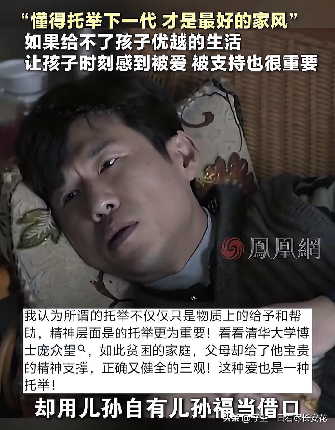 大家记住这句话:“被爱托举过的人,才会懂得如何托举别人,这才是最好的家风。”何谓托举?就是父母弯下腰,让孩子踩着自己往上爬,让孩子在自己的远见和认知基础之上再更上一层楼,孩子会变得轻松,会少走很多弯路,父母在孩子成长过程中就扮演着非常重要的角色,最后受益的还是父母自己。 但问题就在于,大多数父母是没有足够的能力托举自己的孩子的,他们相信儿孙自有儿孙福,相信在外打拼的孩子都混的不会太差,相信随着时间的推移,自己什么也不做,孩子也会过得更好,更有钱,更有出息。可现实是,孩子在外当牛马,向来报喜不报忧,并没有成为爽剧里的主角。 作为父母,如果没有足够的财力托举下一代,一定要尊重孩子的选择,放下自己的控制欲和固有观念,以开放和包容的心态,去理解孩子独特的想法和追求。没有人给孩子铺路,他们的路注定曲折而漫长,时光不语,静待花开。
