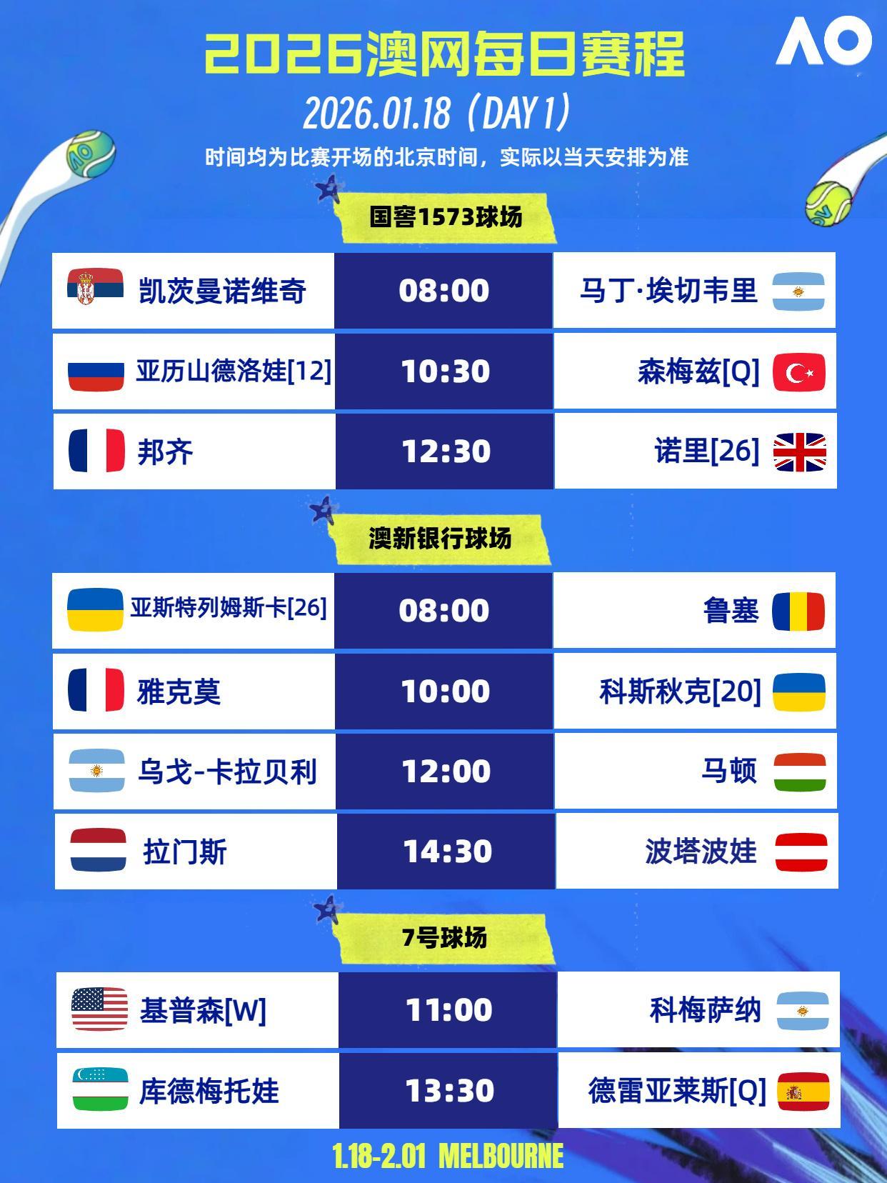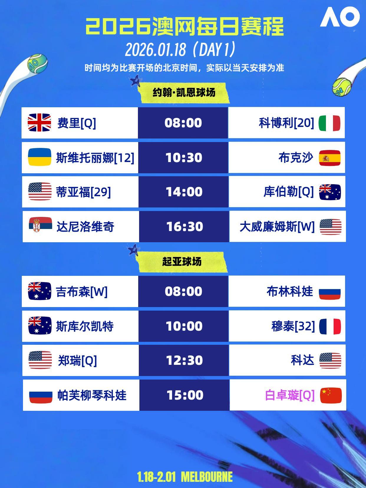 澳网澳网首日赛程出炉 1月18日澳网正赛开启,将进行男女单打第一轮较量。晚场女单
