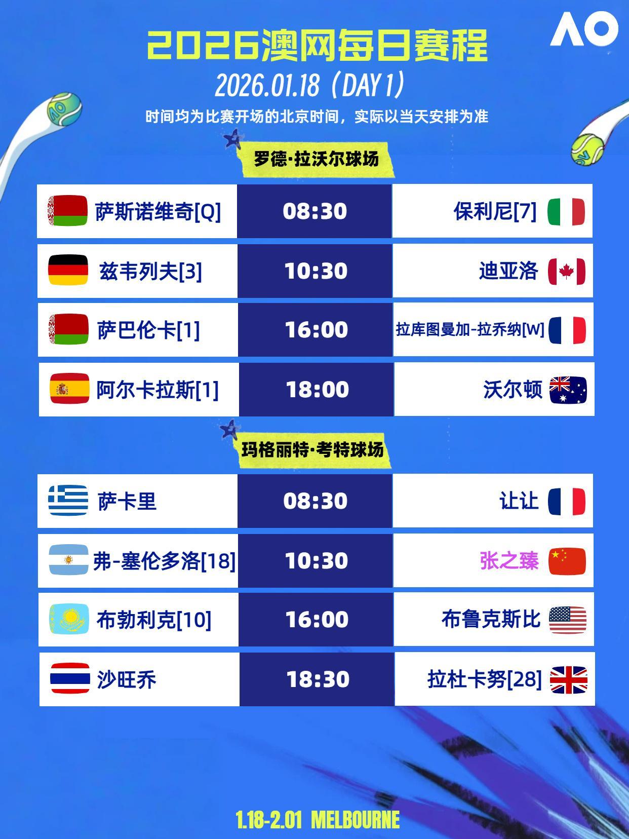 澳网澳网首日赛程出炉 1月18日澳网正赛开启,将进行男女单打第一轮较量。晚场女单世界第一🇧🇾萨巴伦卡、男单世界第一🇪🇸阿尔卡拉斯将亮相中心球场。中国球员将有两位首日登场:📍玛格丽特·考特球场 10:30🇨🇳张之臻 VS 🇦🇷弗-塞伦多洛[18]📍起亚球场 15:00🇨🇳白卓璇 VS 🇷🇺帕夫柳琴科娃