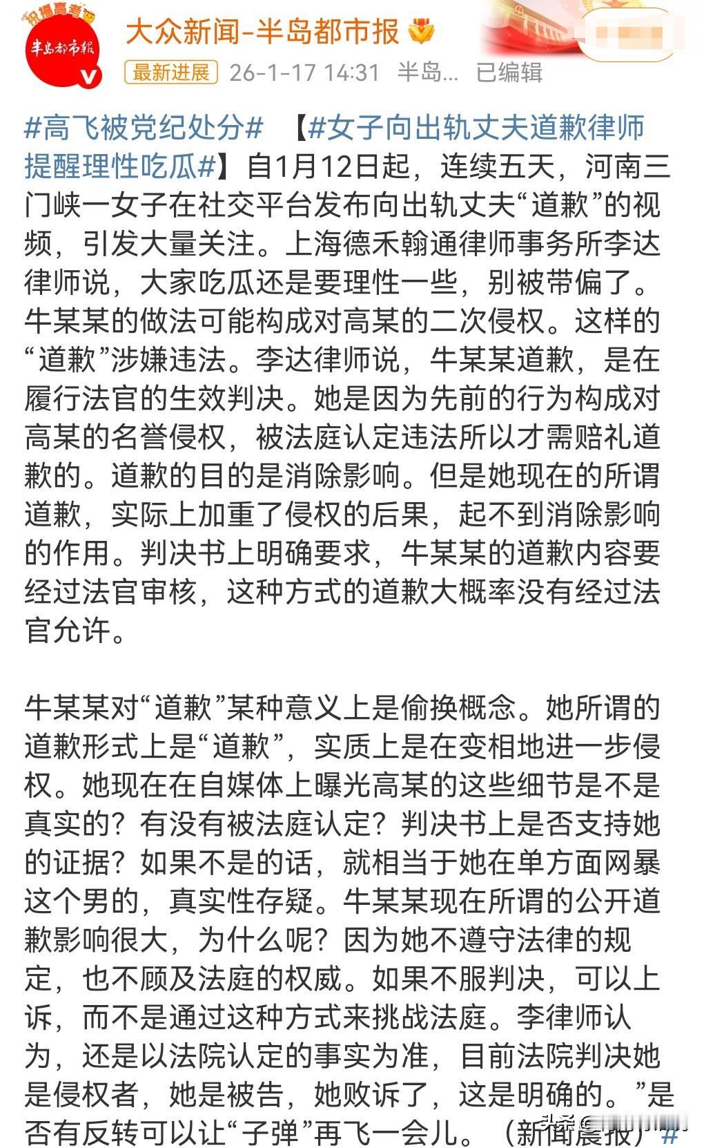 这名女子被判决要向自己的丈夫道歉。然而她的道歉表面上看似是道歉,其实是更加的让自己的丈夫社死。 这又形成了一个新的侵权行为。 当然了,她老公出轨那也非常的错误,受到了党纪的处分。 1月17日热搜,向出轨丈夫道歉女子称直播被封。 不被封才怪,毕竟是一个三观不正的行为,那肯定平台不会对她进行放任不管的。