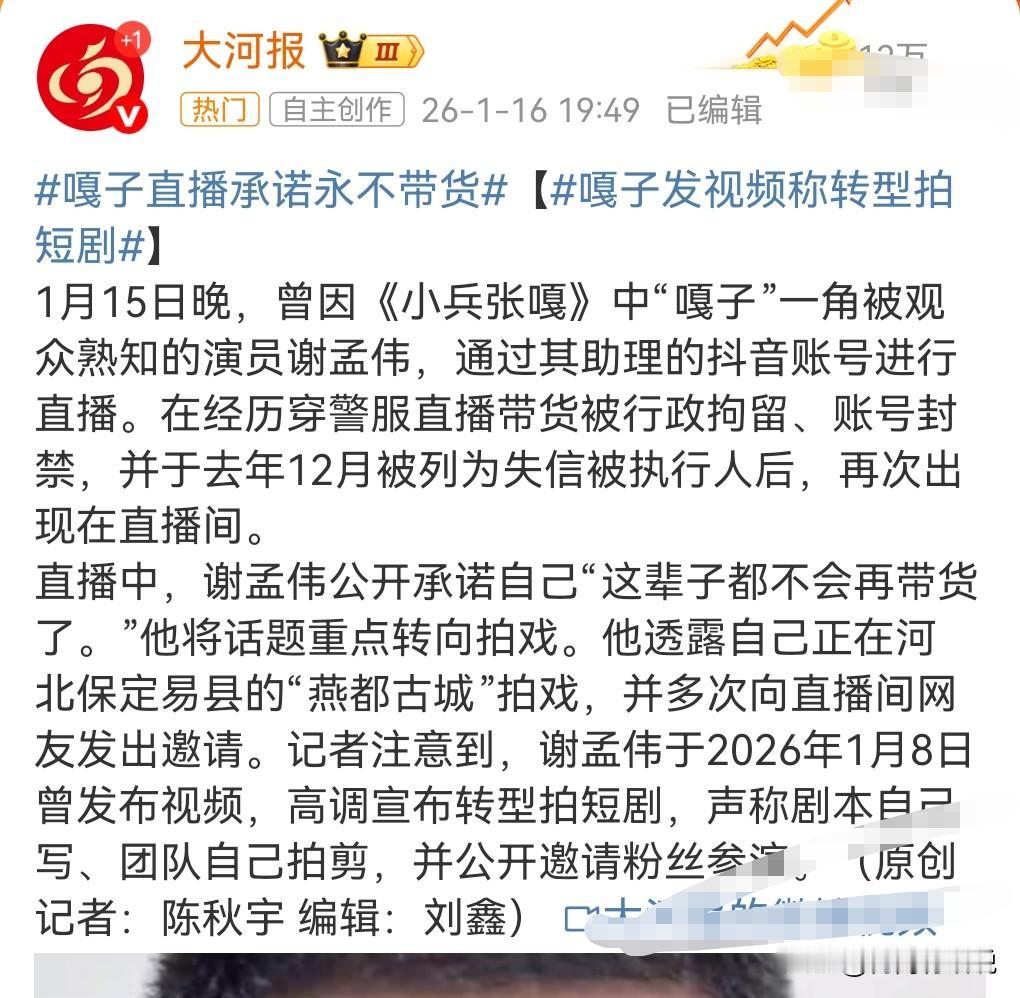 嘎子哥,这又是在搞什么事情?嘎子直播承诺永不带货。 近日,嘎子哥在助理的直播间称,这辈子都不在带货了。 真的假的啊?他也不是第1次做出这样的承诺了,这次能够一言为定吗? 要是再次忽悠网友的话,那这个事情又会被反复的提及呀,他的那点口碑还立得住吗? 他说他准备拍短剧了,他说他没钱,但是又自筹资金拍短剧,这怎么这么矛盾呢?