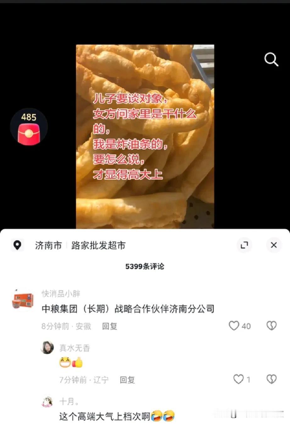 就说嘛,评论区里出人才,这话一点也不假。 一个炸油条的阿姨向网友征询,他儿子要谈对象,若是女方问家里是干什么的,阿姨怎么说才能显得高端大气上档次? 网友告诉他就叫“中粮集团长期战略合作伙伴济南分公司”,不得不说呀,够高端,够大气,但是也太大了,不知道女方听完后能不能一时接受了。 减肥你成功了吗? 为什么好多人希望进体制内工作 男人追求女人不都是看颜值的吗?