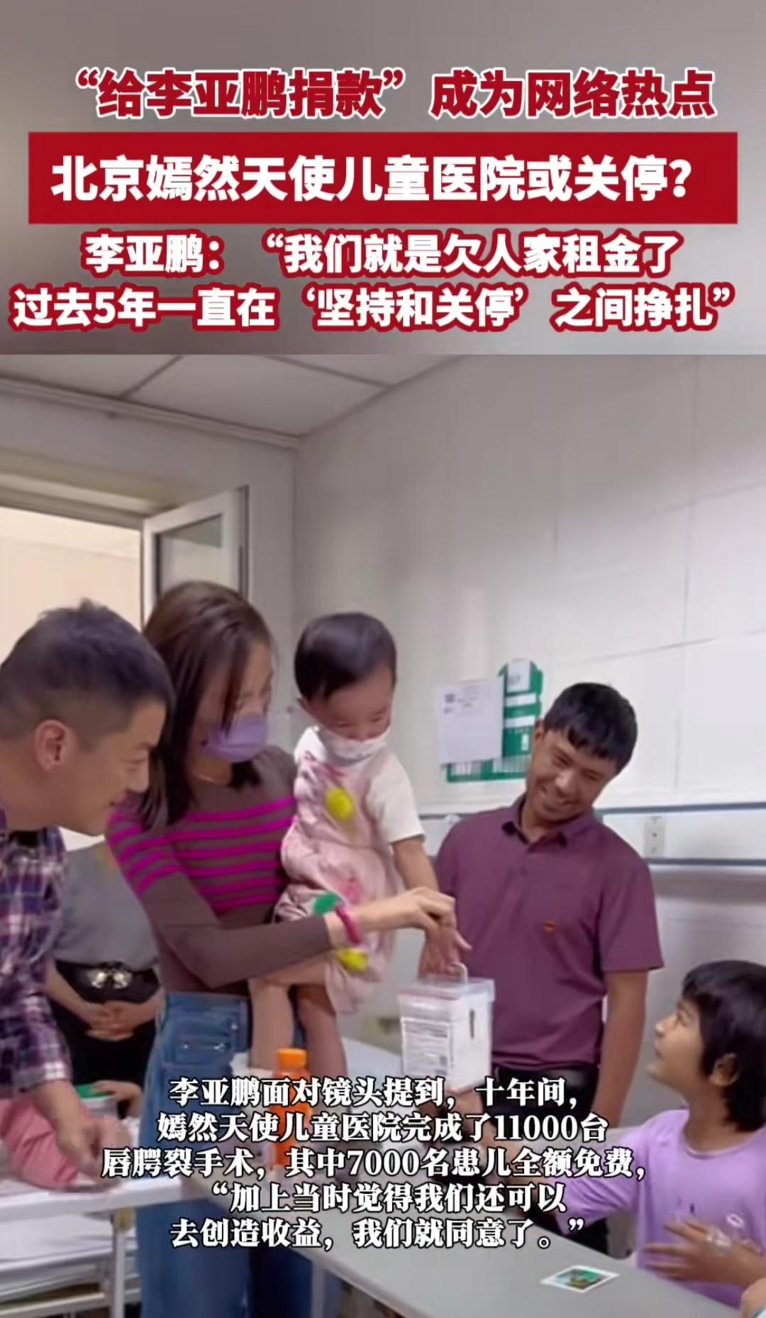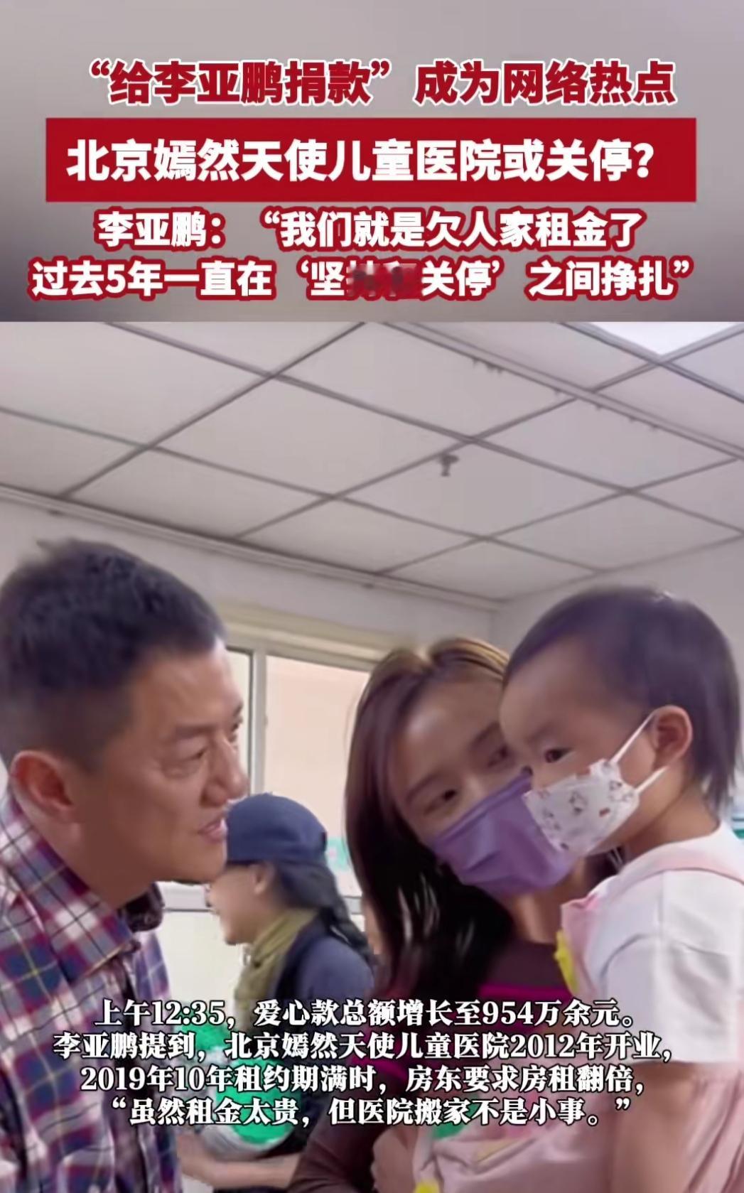 谁能想到?李亚鹏牵头的嫣然天使儿童医院,开了14年就做了11000台唇腭裂手术,其中7000台是全免费的——多少穷家庭抱着畸形娃,是在这儿等到“能正常笑”的机会。可这两天热搜炸了:医院欠了2600万租金,眼看要关停。 李亚鹏对着镜头说,2019年租约到期时房东突然要翻倍涨租,他咬着牙应了——毕竟搬医院不是挪柜子,设备、患儿复诊都是牵绊。结果这5年就没从“撑下去”和“关张”的拉扯里出来过,撑到现在账上的窟窿越积越大。 这两天网友自发捐了954万爱心款,可离2600万的缺口还差一大截。当年为救孩子搭的“救命站”,现在要塌了,最慌的是那些排着手术号的家庭——他们的娃,还能等到能正常说话的那天吗?