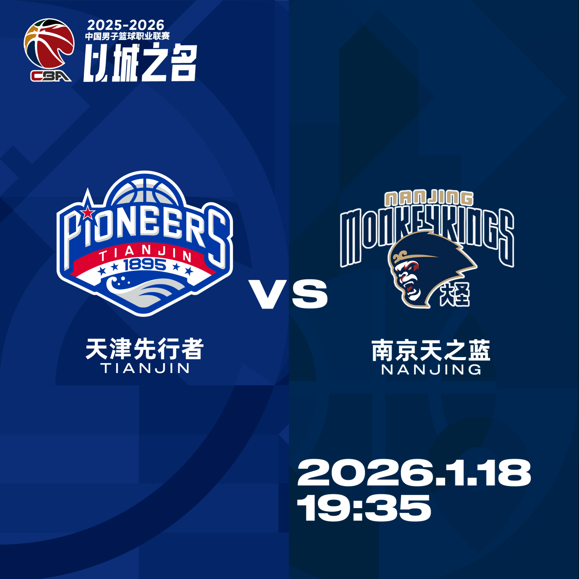 虎扑01月17日讯据天津男篮发文,1月18日,2025-2026赛季CBA常规赛第16轮,天津先行者主场迎战南京天之蓝,本赛季双方首次交锋,先行者内外开花、全队发力,以104-76客场大胜对手,拼下赛季首胜。此番再度相遇,先行者正携两连胜的昂扬势头坐镇主场,而南京天之蓝也以带着胜利的状态前来挑战。本次二番战,先行者将继续以敢打敢拼的姿态迎接挑战,全力冲击三连胜。