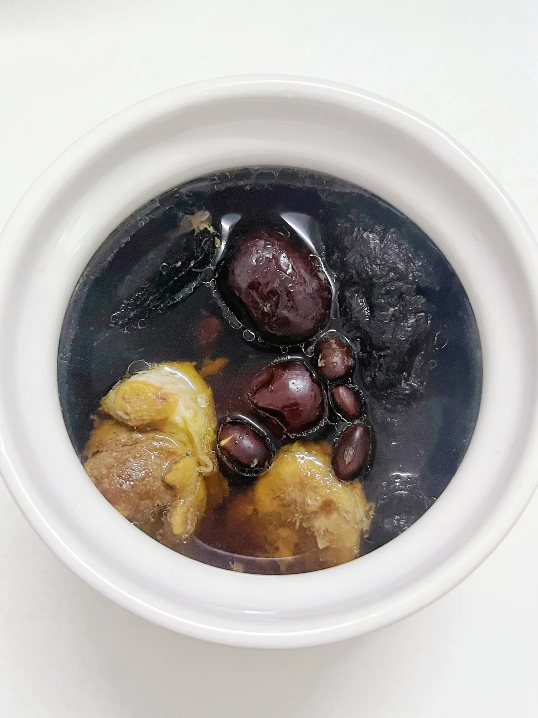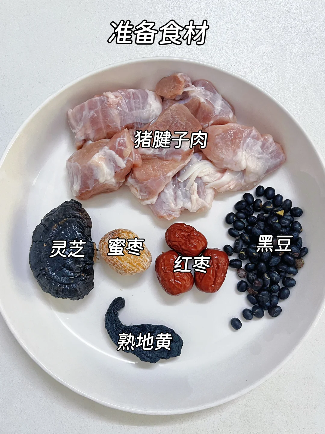 猪腱子肉 150g、灵芝 1小块、熟地黄 2片、黑豆 30g、红枣 3颗、蜜枣 1颗、