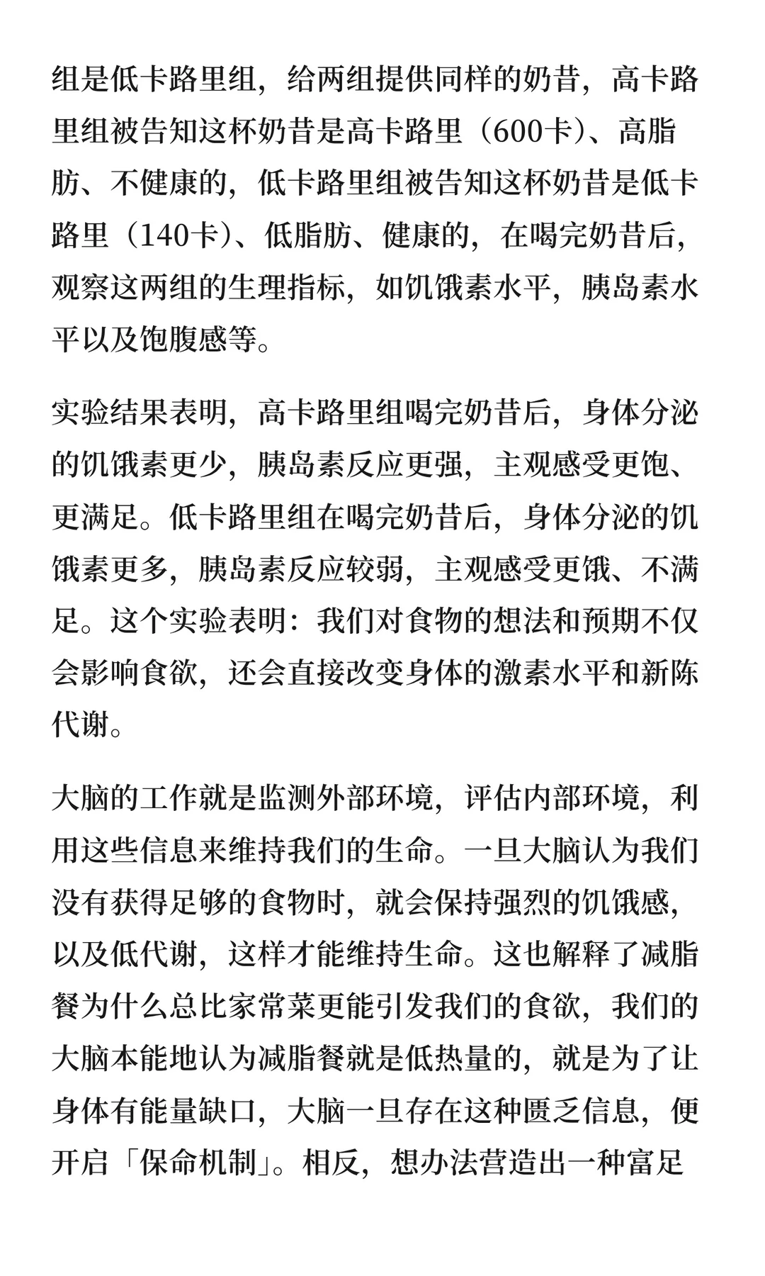🍦著名的「奶昔实验」发现:同样一杯奶昔,告诉A组它是“高热量”,他们的饥饿素下降,饱腹感更强;告诉B组它是“低热量”,他们反而更饿!这说明:大脑会根据“设定”调节身体反应。