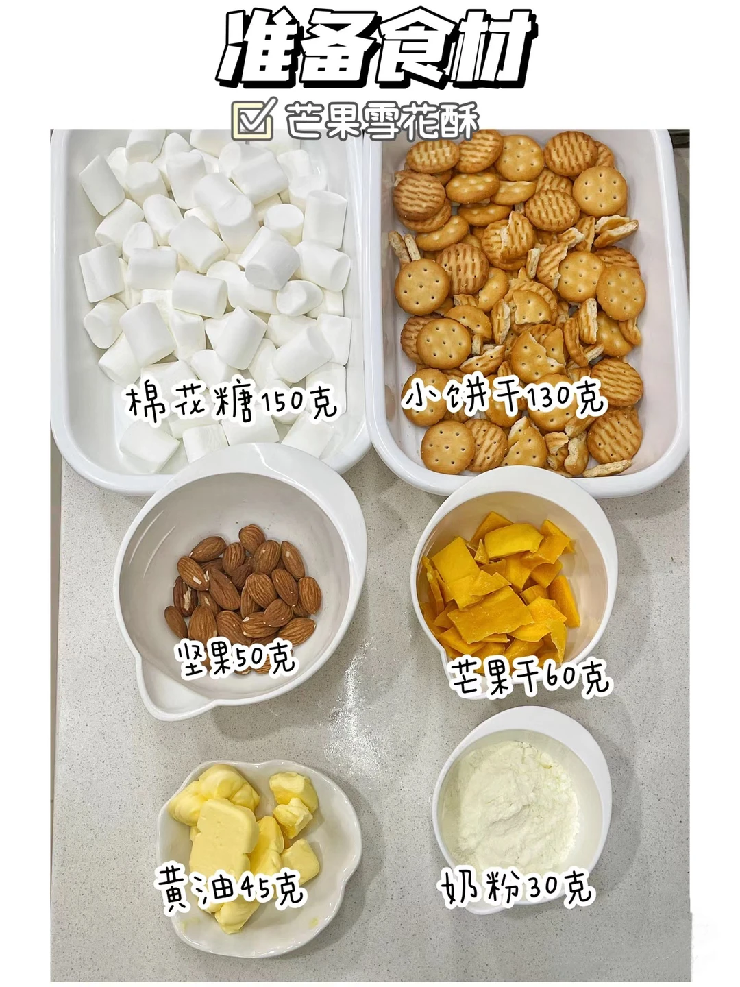 🔹准备食材:棉花糖150克、黄油45克、奶粉30克、饼干130克、巴旦木50克、芒果干60克.