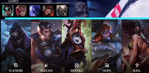 AL选用:Flandre阿萝拉;Tarzan赵信;Shanks阿卡丽;Hope厄斐琉斯;Kael露露