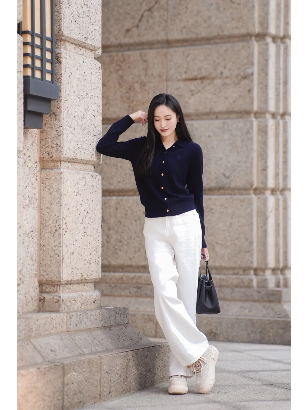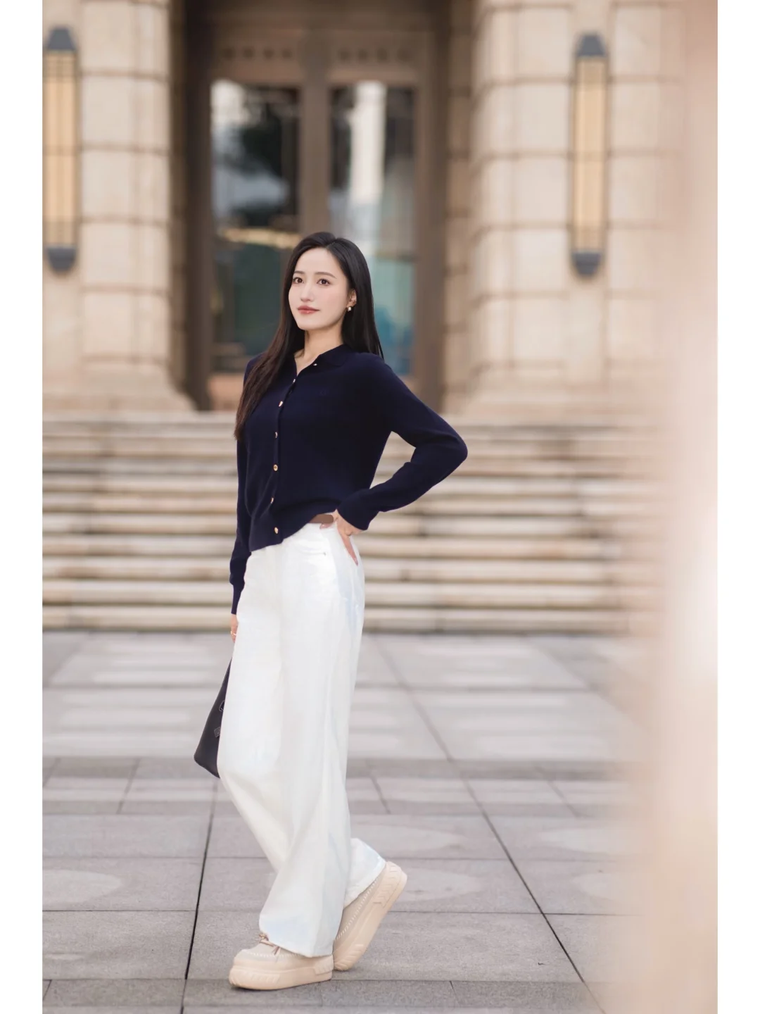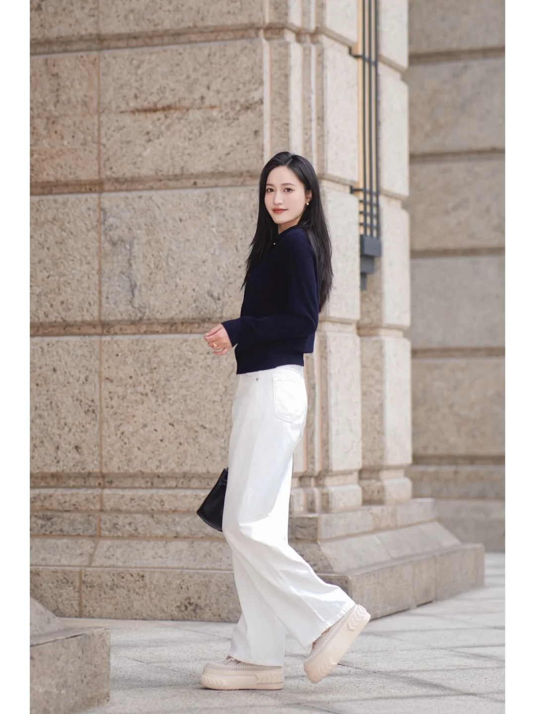 藏蓝色羊毛针织好柔软 搭配白色牛仔裤 一套干干净净的感觉~