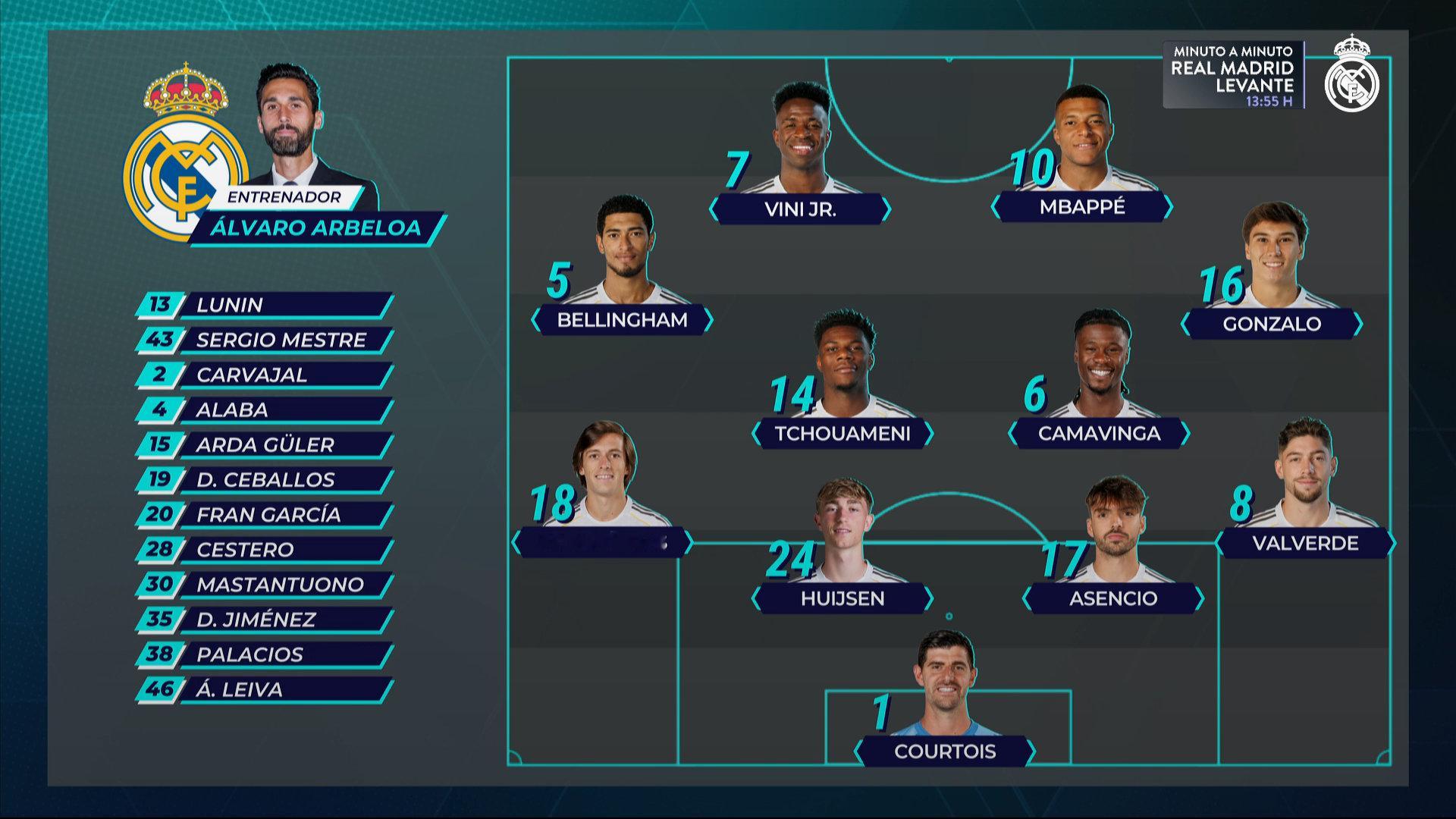 【首发十一人】姆巴佩回归!【前锋】威尼修斯、贡萨洛、姆巴佩【中场】贝林厄姆、楚阿梅尼、卡马文加【后卫】卡雷拉斯、赫伊森、阿森西奥、巴尔韦德【门将】库尔图瓦西甲联赛 皇马vs莱万特 halamadrid